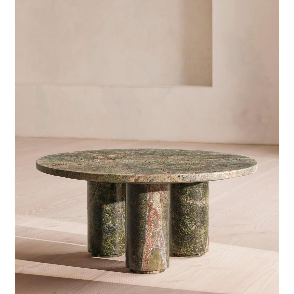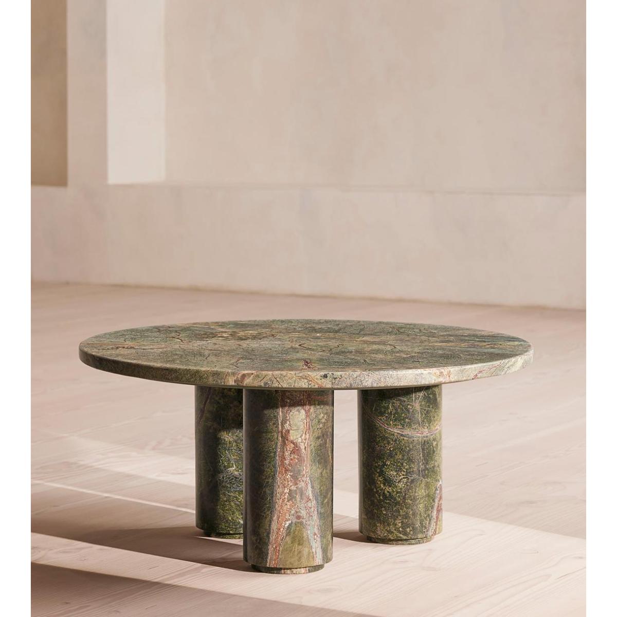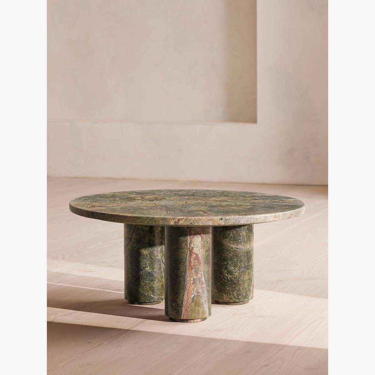I’m really drawn to this green-marble coffee table for its bold veining and architectural base - it feels both sculptural and grounded. It works beautifully in contemporary or mid-century rooms, especially against light walls or dark timber floors, and it brings an unexpected pop of colour to a neutral palette. For styling, keep things simple: a low ceramic vase, a neat stack of coffee-table books and perhaps a small candle. Balance its solidity with leaner furniture lines (think slender-legged sofas or armchairs) and layer in a soft, textured rug to soften the overall look.