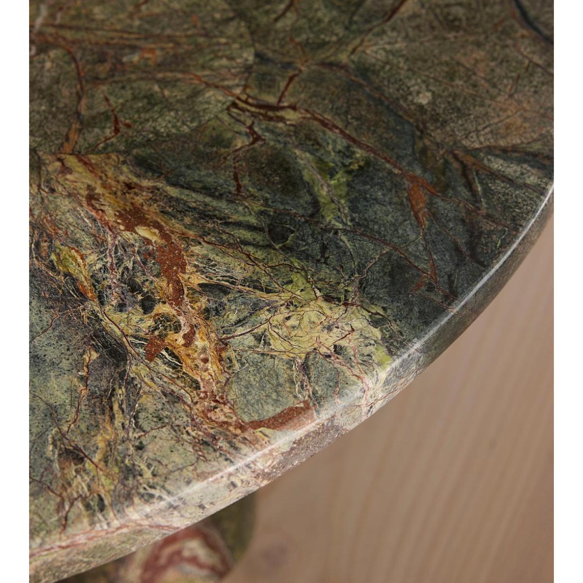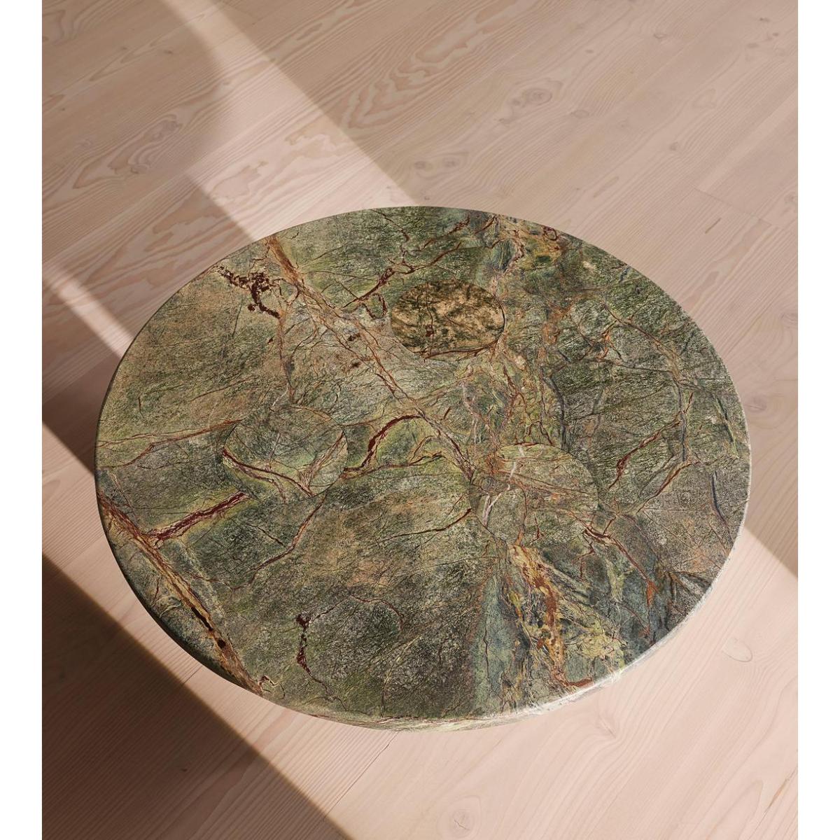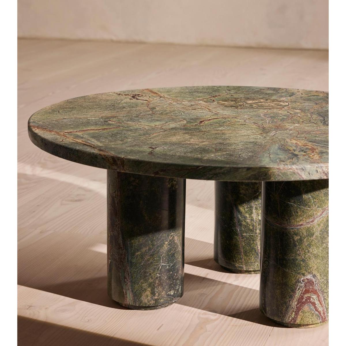 I’m really drawn to this green-marble coffee table for its bold veining and architectural base - it feels both sculptural and grounded. It works beautifully in contemporary or mid-century rooms, especially against light walls or dark timber floors, and it brings an unexpected pop of colour to a neutral palette. For styling, keep things simple: a low ceramic vase, a neat stack of coffee-table books and perhaps a small candle. Balance its solidity with leaner furniture lines (think slender-legged sofas or armchairs) and layer in a soft, textured rug to soften the overall look.