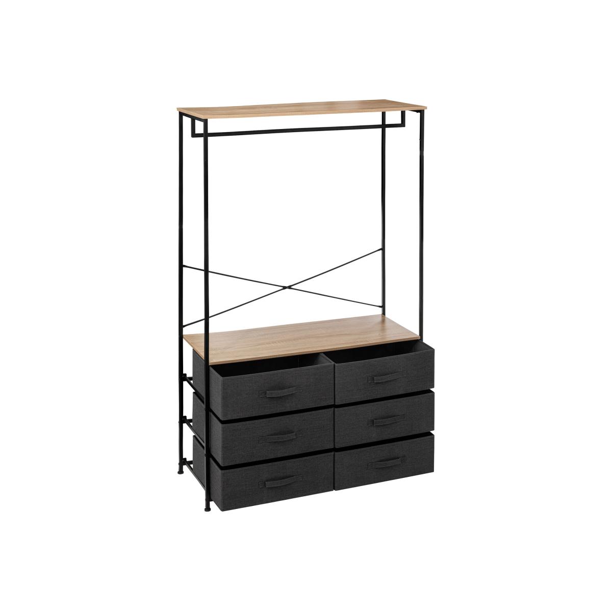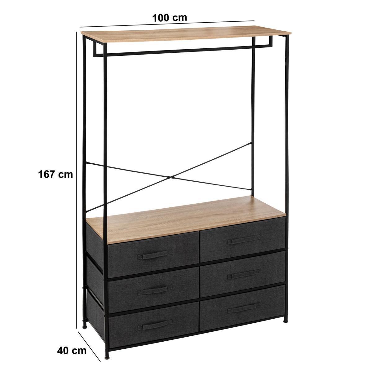 * Includes metal hanging rail* Features 6 fabric draws with handles* Compact design Store coats and shoes simultaneously with this Hanging rail and set of draws. Designed as a compact modern piece of furniture the grey colour and metal frame are perfect for blending seamlessly in modern spaces.