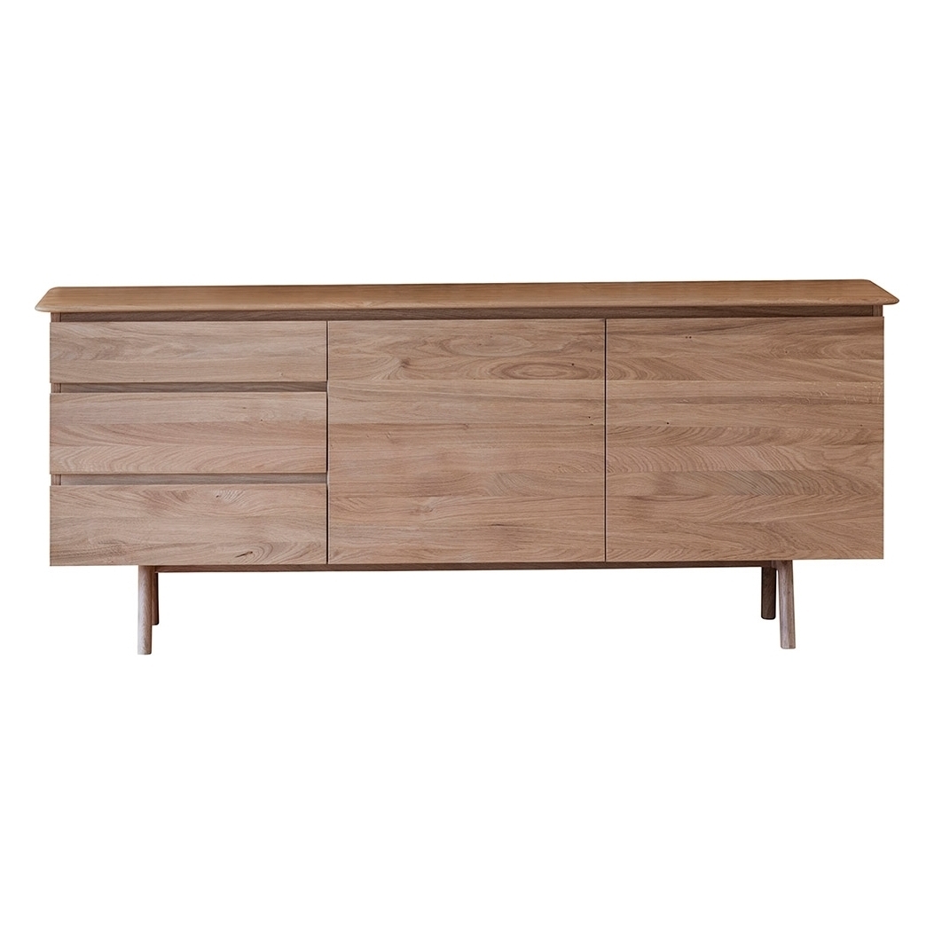 This light wooded Toarmina Sideboard is the perfect unit to store away your mess. A multifunctional stylish addition to the dining room, living room, or even the hallway, this display will be happy to home your goods. The presence of this sideboard not only adds a touch of style to a room but also creates space for you to display your most-loved items. Complete with two cupboards containing a shelf each, and three drawers, you will have no excuse for random bits and bobs around the house!.