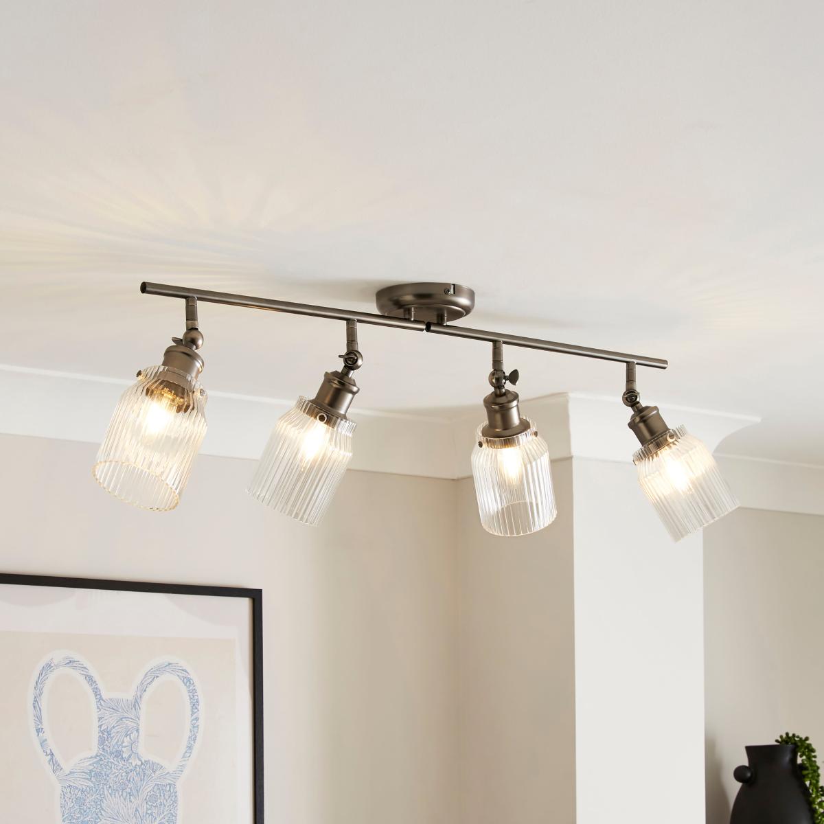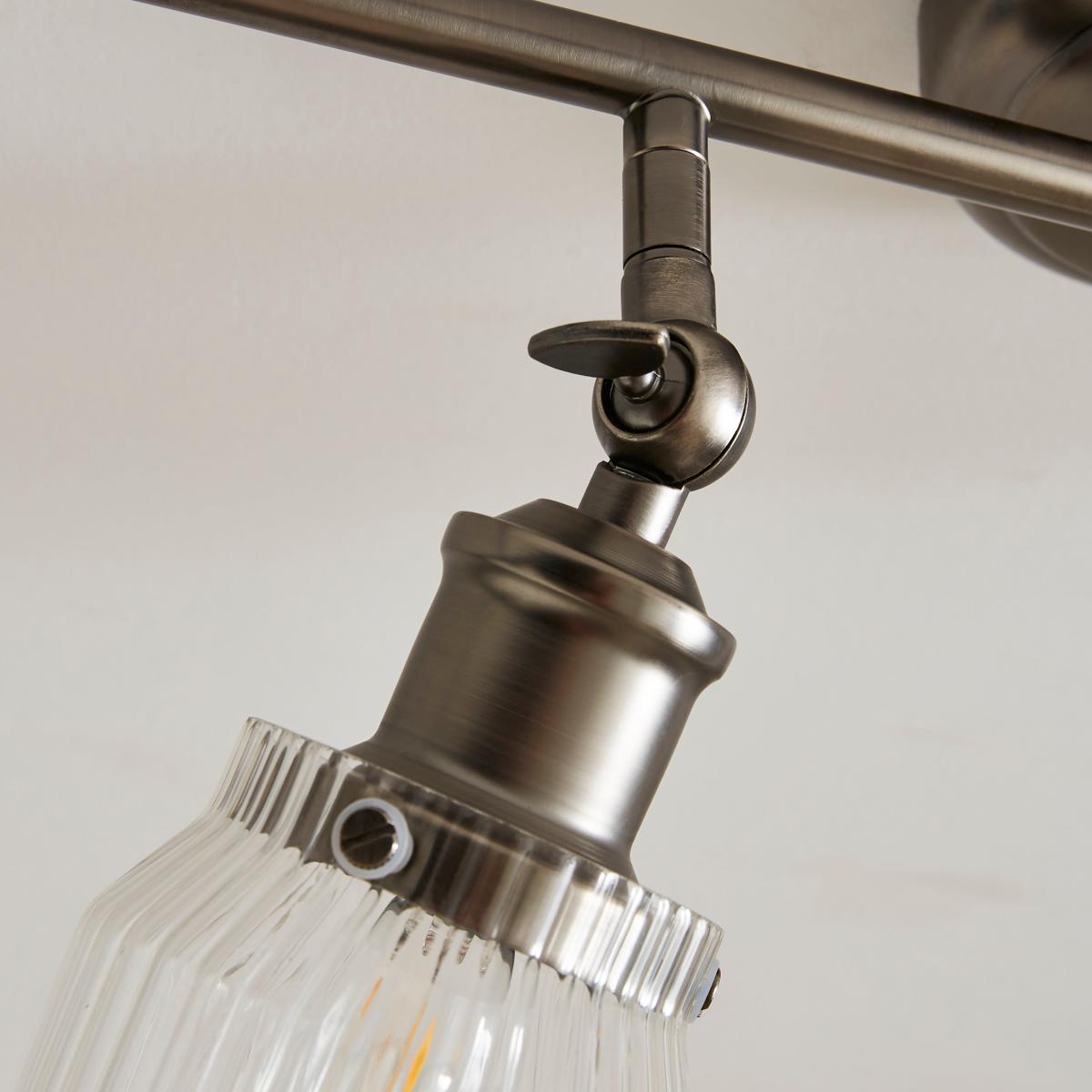 * Industrial Design* Ribbed, Glass Shades* Adjustable Heads* Dimmable with Compatible Bulb & Switch Make a statement with the Tobias Industrial Ribbed 4 Light Adjustable Spotlight Bar. Featuring ribbed glass shades and a matt pewter finish, it's a gorgeous industrial-inspired design. With adjustable spotlight heads, you can tailor the lighting to suit your space perfectly. Dimmable when used with the appropriate bulb and switch, it offers versatility and ambience for your dining room or living room.