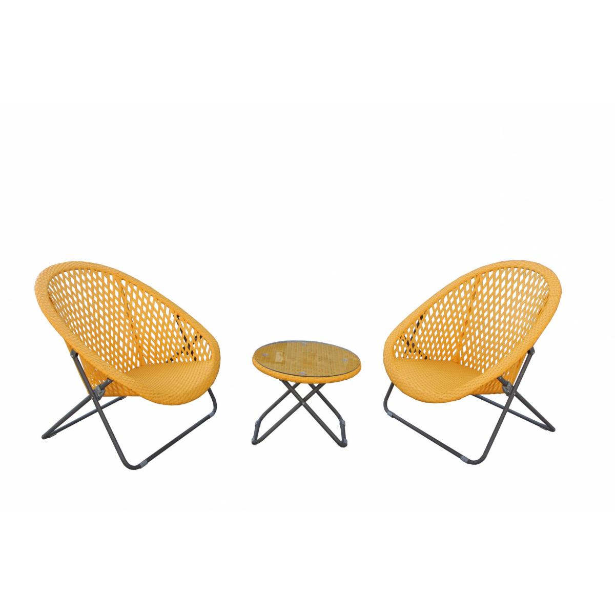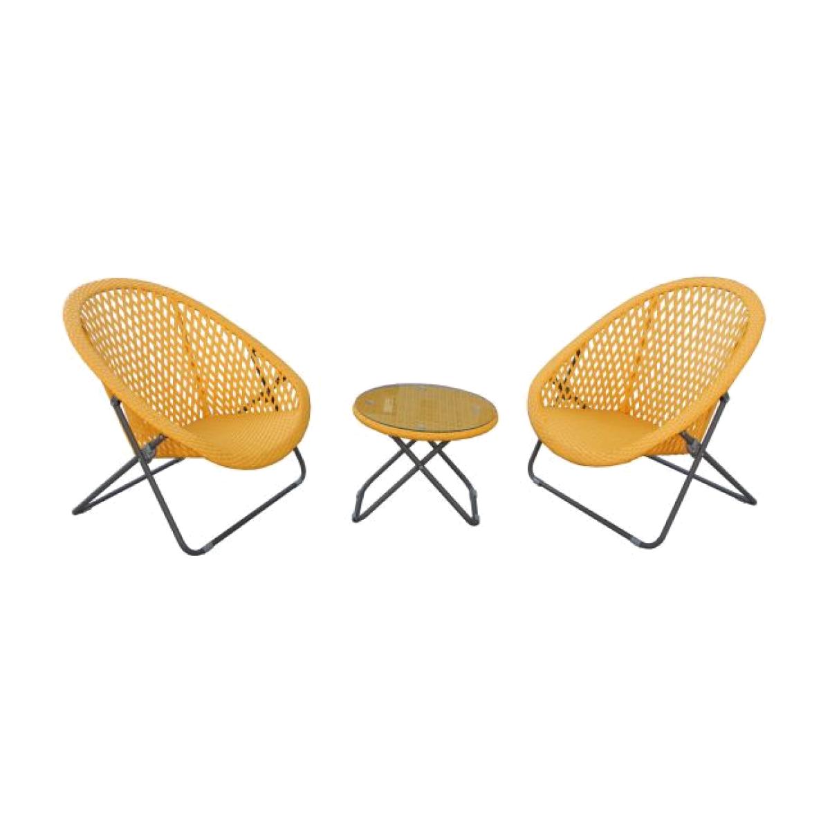 Relax with the faux Rattan Lounging Set from TOBS. Each set includes two comfy chairs for you to relax in and one side table. Great for use in the conservatory or outdoors in your garden. Each piece is fully weather proof and folds away neatly for easy storage in the winter months. Features: Includes two chairs and one side table. Faux rattan Glass table top Chairs and table fold away for easy storage Grey tubular metal legs with floor grips Wipe clean only Fully assembled Dimensions: Chair - W: 73cm D: 82cm H: 85cm  Table - W: 50cm D: 50cm H: 42cm