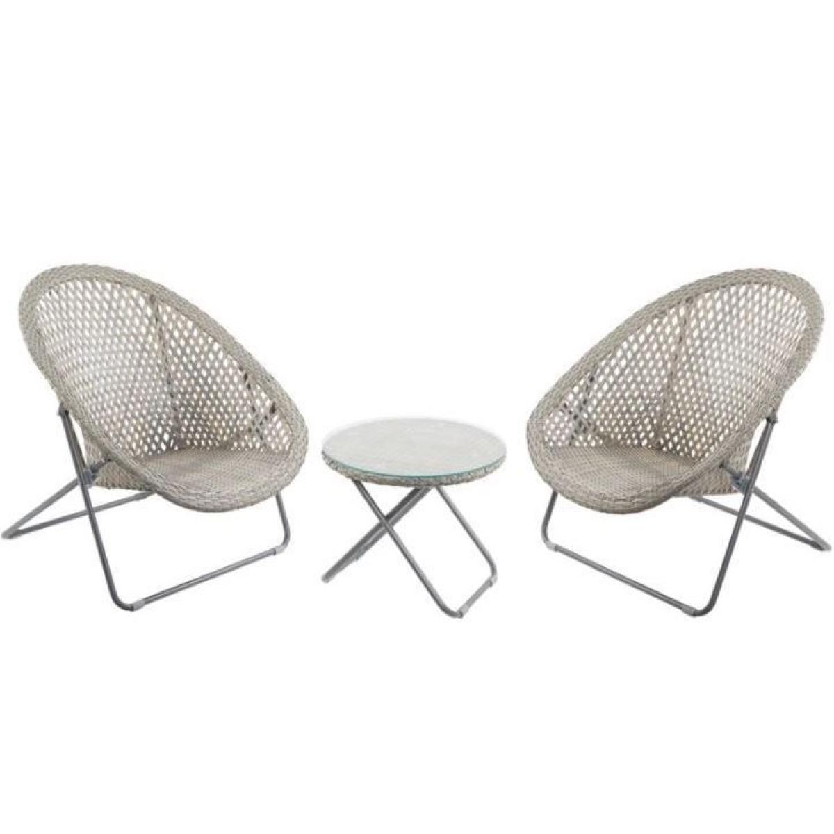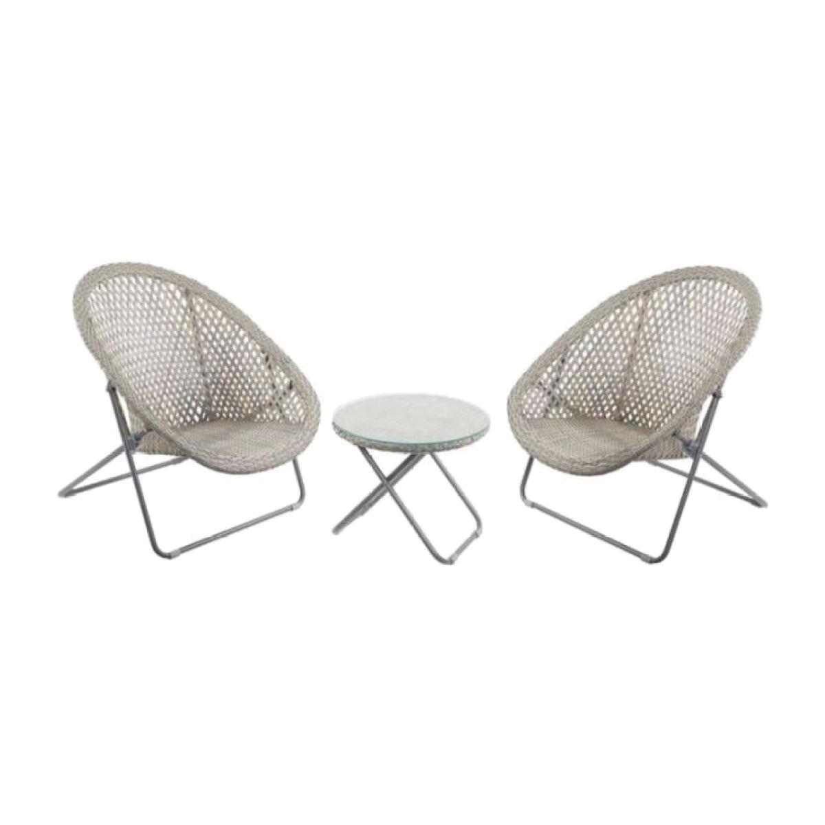 Relax with the faux Rattan Lounging Set from TOBS. Each set includes two comfy chairs for you to relax in and one side table. Great for use in the conservatory or outdoors in your garden. Each piece is fully weather proof and folds away neatly for easy storage in the winter months. Features: Includes two chairs and one side table. Faux rattan Glass table top Chairs and table fold away for easy storage Grey tubular metal legs with floor grips Wipe clean only Fully assembled Dimensions: Chair - W: 73cm x D: 82cm x H: 85cm Table - W: 50cm x D: 50cm x H: 42cm