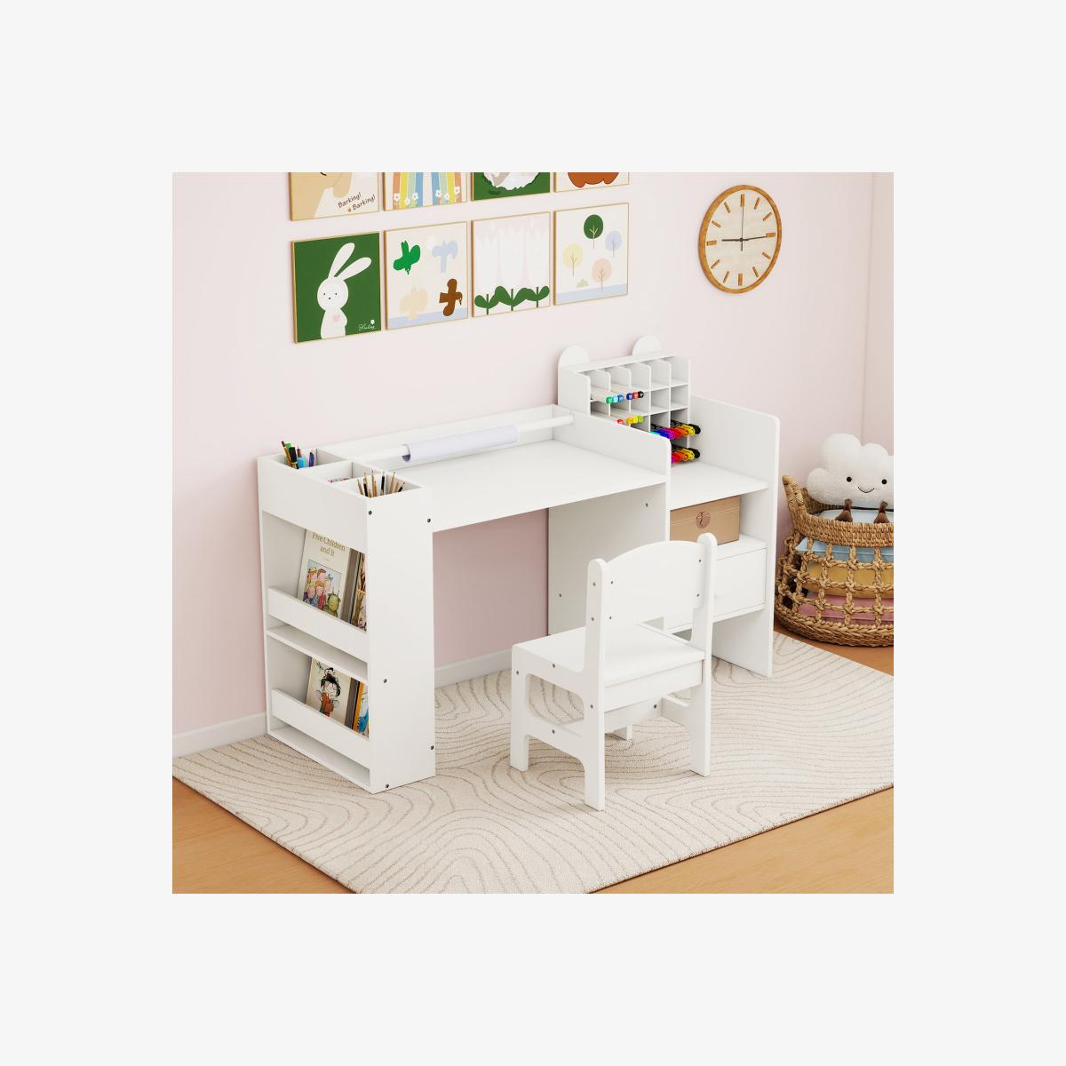 Boasting a spacious tabletop, handy paper roll holder, and multiple storage options (drawer, cube organizer, bookshelf), this kids art table keeps everything tidy and within reach. The comfortable chair and child-safe rounded edges ensure comfort and protection, while the guard rails on side shelves prevent supplies from falling out. Whether it's a playroom essential or a classroom must-have, this toddler desk and chair set is a thoughtful gift for inspiring imaginative play and learning in children aged 3+ years old.