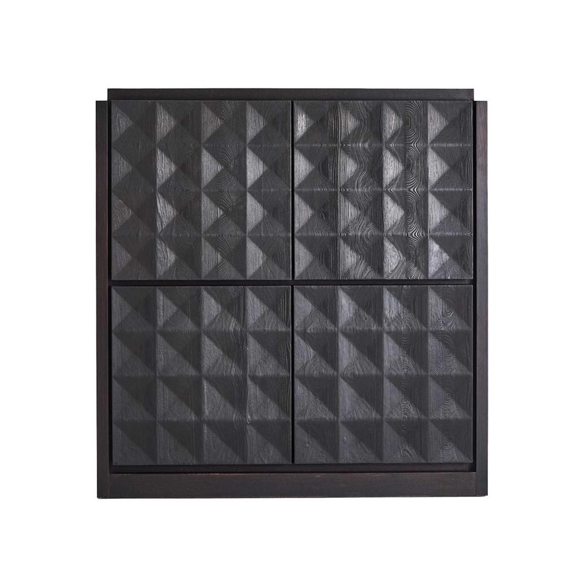 This bold sideboard is crafted from black oak and features a striking geometric façade with a textured, three-dimensional pattern. Its four-door design offers ample storage while making a dramatic visual statement. A perfect fusion of form and function, ideal for modern or contemporary interiors.