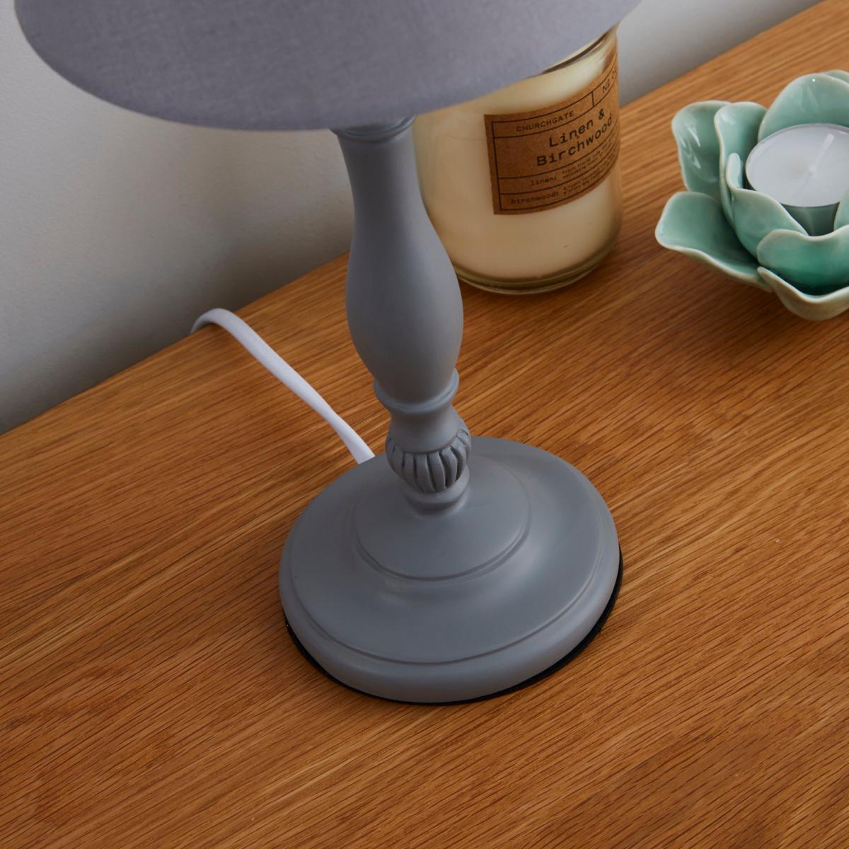 Available in grey this table lamp features a grey fabric shade for matching colourway while its small design means it does not take up alot of space in your home.