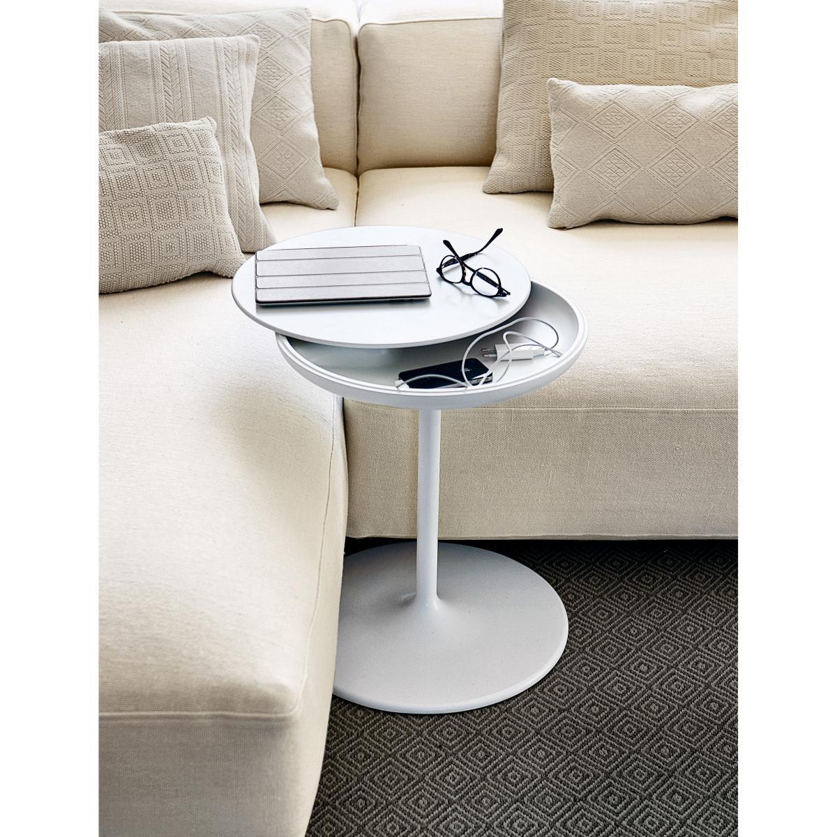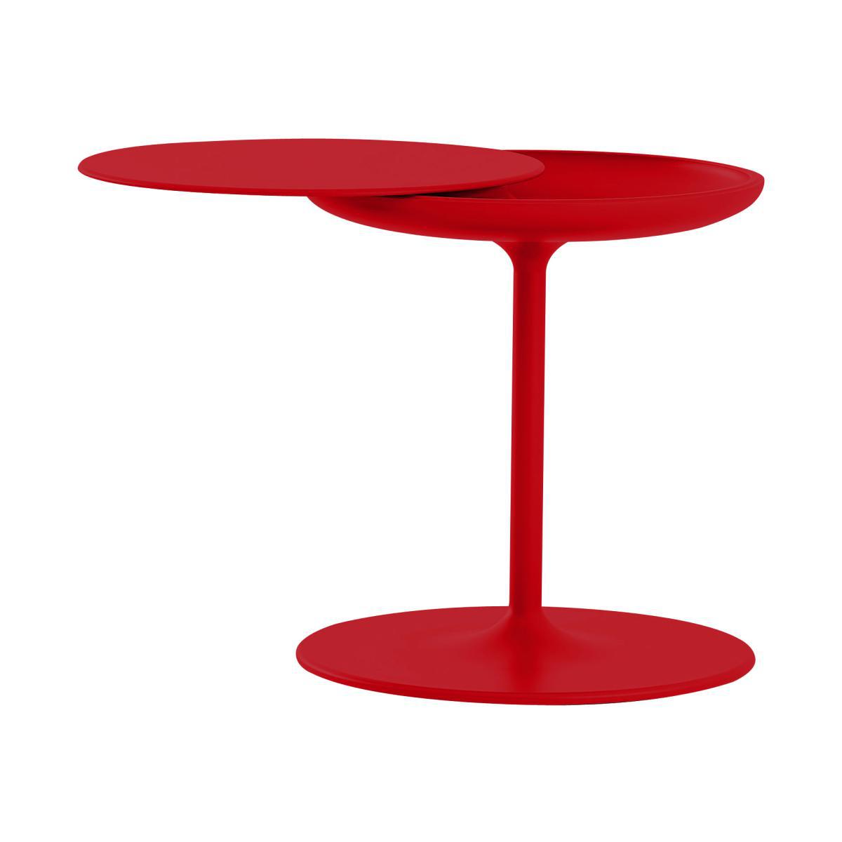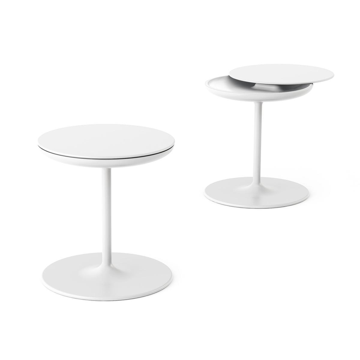 Small table. Stiff polyurethane frame. Aluminumcovered plywood top. Varnish in white, black, red or light blue. Organizer compartment revealed by rotating table top 360°.