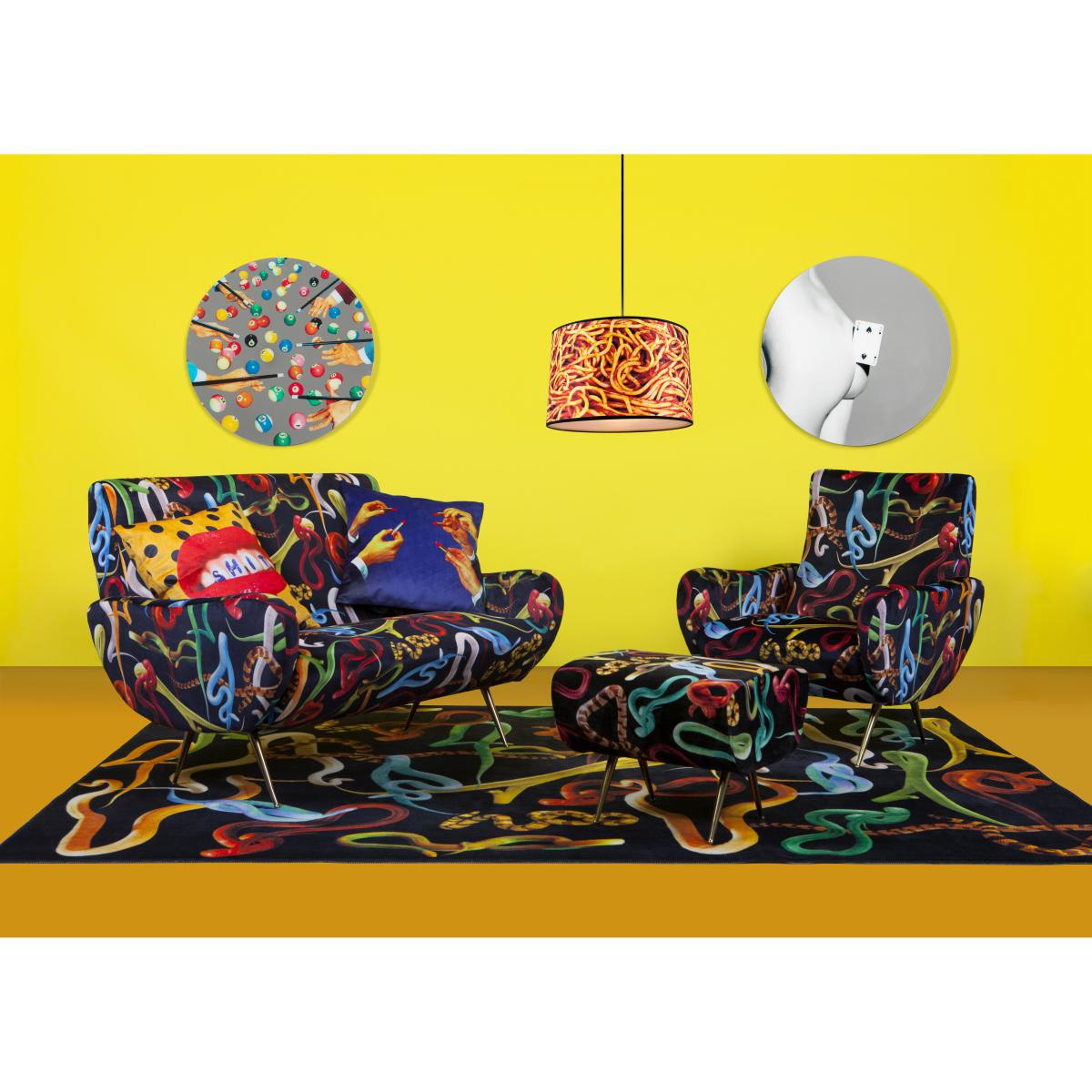 It is Maurizio Cattelan, an inescapable figure of contemporary art, and photographer Pierpaolo Ferrari who created this capsule collection for Seletti. Unlike any other, it is provocative, amusing, absurd and eccentric all at once. The items in the collection are decorated with surrealist images taken from the Toilet Paper magazine, founded in 2010 by two Italian artists. Perfectly manicured cut-off fingers, soap with a bite taken out of it, fish stuffed with precious gems, a canary with a cut-off wing, and more. Dreamlike Toilet Paper motifs tinted with black humour inspired by the worlds of fashion and advertising, combining commercial photography, twisted visual narratives and surreal imagery. Toilet Paper questions our contemporary obsession for images, explores our most unspeakable desires and urges. All the items in the Toilet Paper collection present startling scenes, mixing disturbing normality and troubling ambiguity, stirring feelings of horror combined with visual pleasure. A work of art in itself, the Toilet Paper collection questions, due to its accessible price and wide distribution, the nature and limits of the contemporary art market. This question has always been central to Maurizio Cattelan's work. A bold graphic display highlighted with bright and contrasting colours, one thing is for sure – these Toiletpaper cushions will attract everyone's attention! With their velvet covering with intense colours and their down padding, these cushions give incomparable comfort.