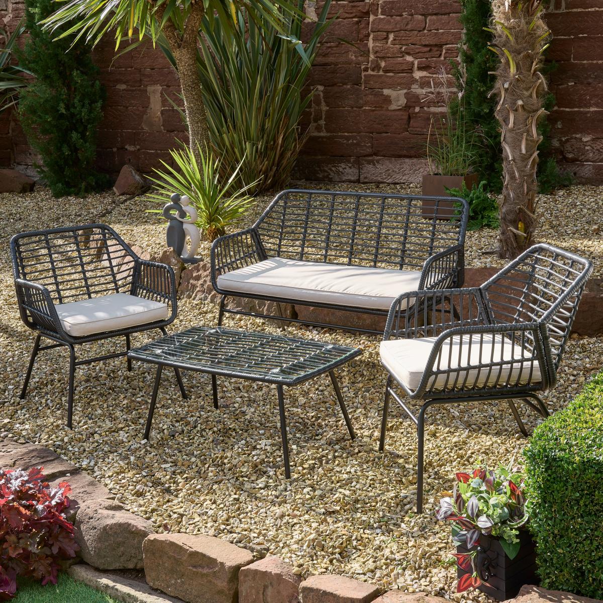 Complete with generously filled seat cushions for ultimate comfort and back support, this conversation set is the perfect addition to any garden or patio. Made from 100% recycled polyester, its cushions are super soft and long-lasting, so you can spend more time relaxing in the sun!.