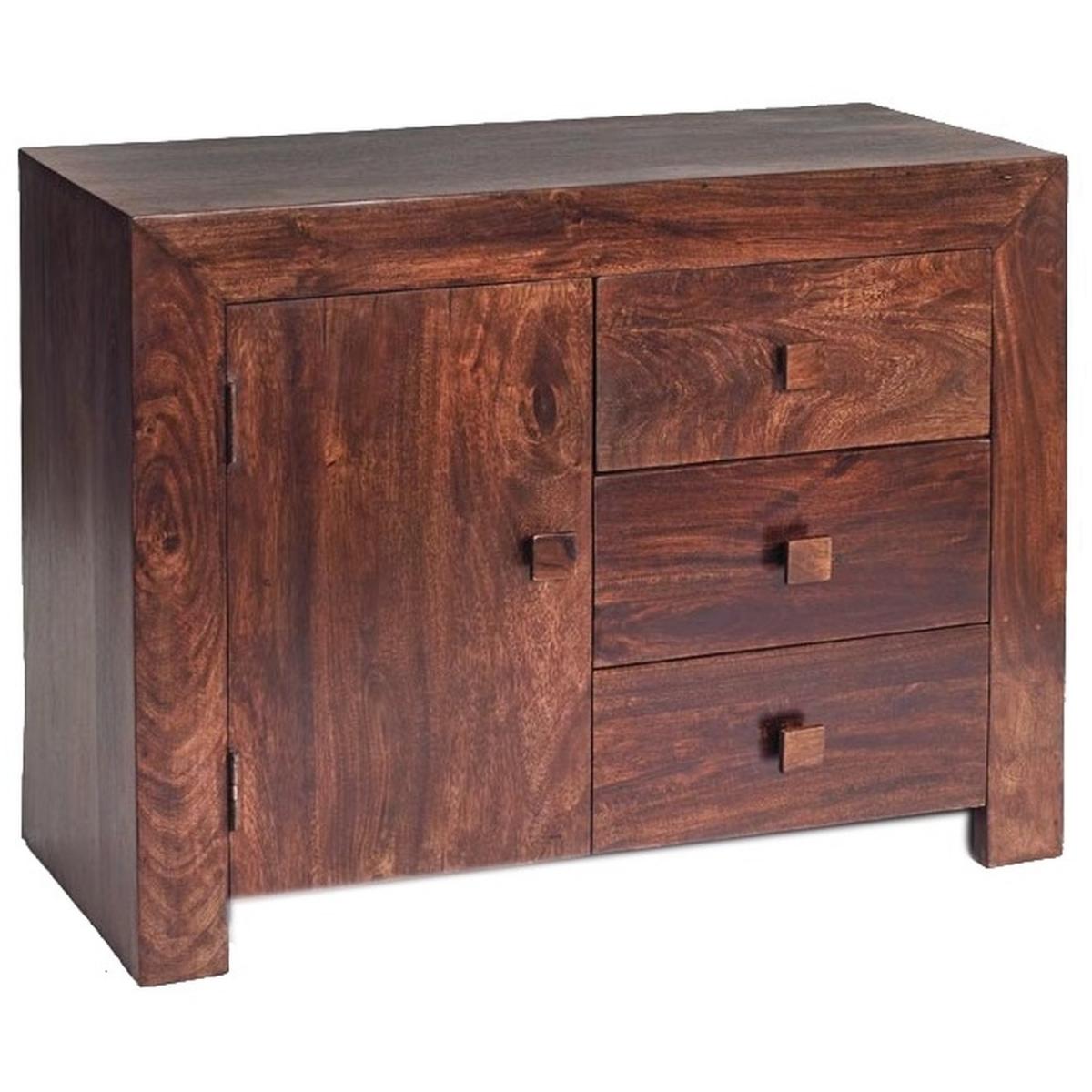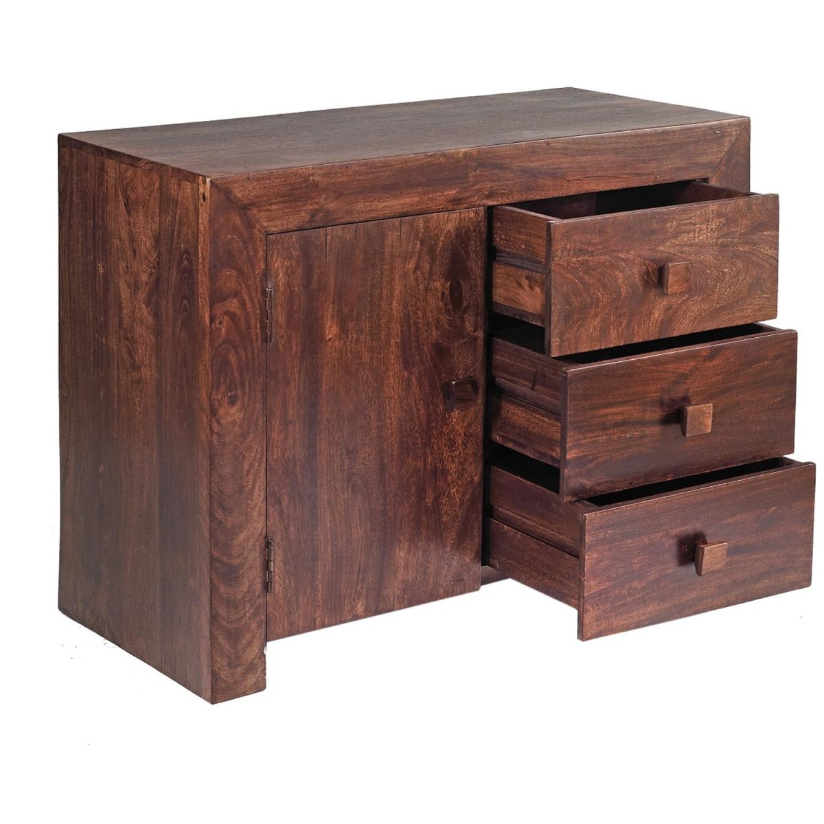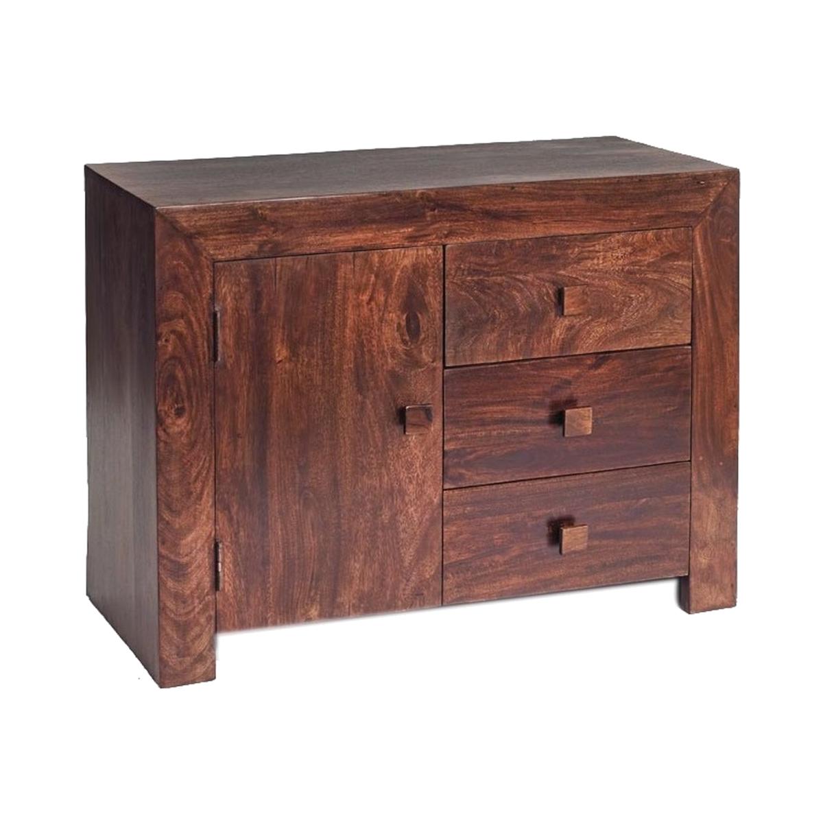 Made from 100% Solid Mango Hardwood. Hand Crafted from Eco-Friendly Wood. Deep Walnut Colour, No Assembly Required. The Toko Mango Cube Sideboard has a classical design featuring 3 large drawers and 1 Door with a shelf inside. You will not be short of storage for whichever room you decide to furnish.