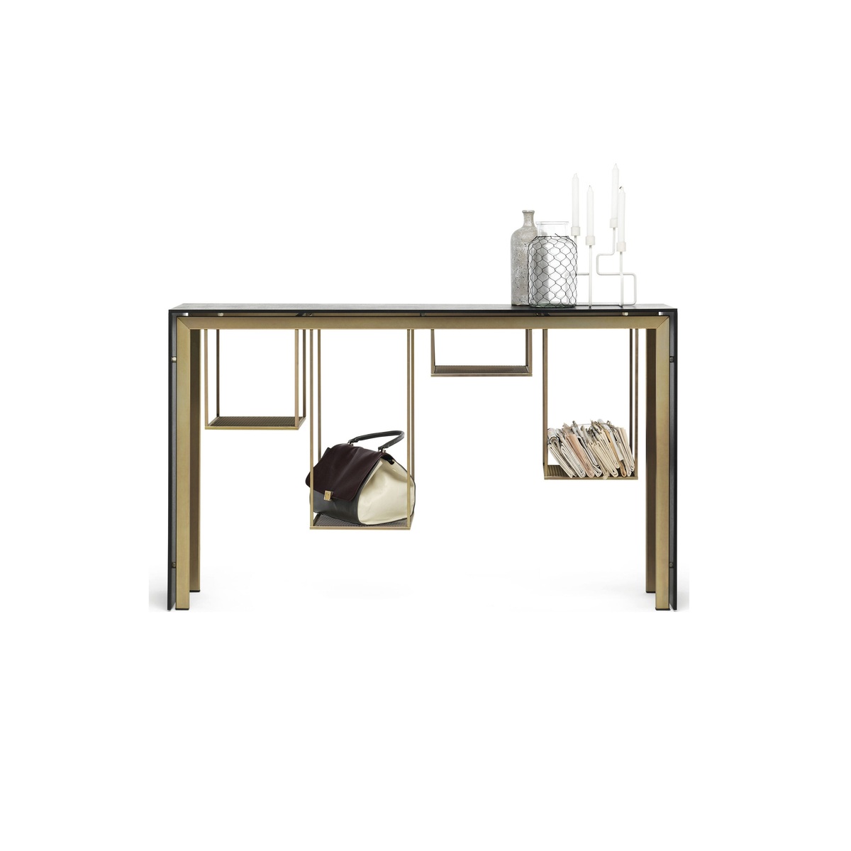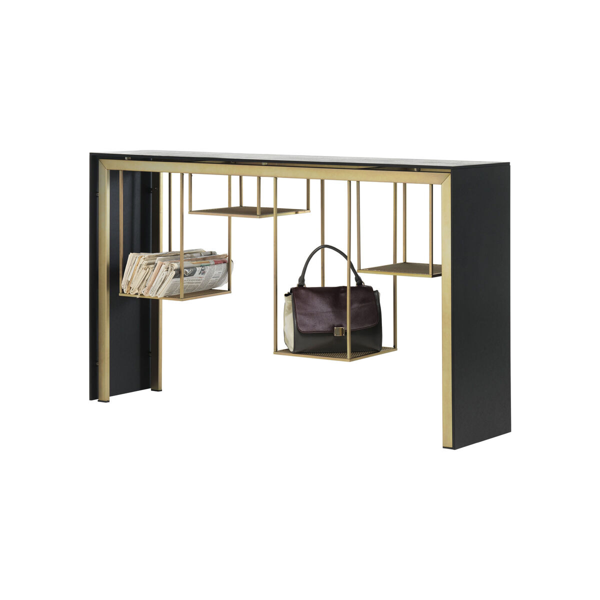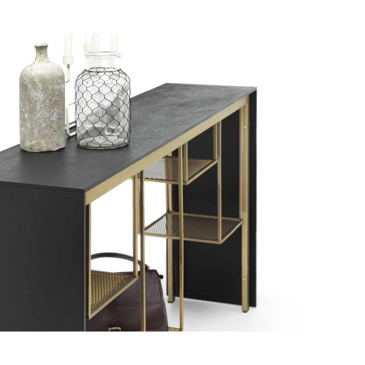 The Tokyo console stands out due to its originality! It offers an elegant and practical design and gives pride of place to an unusual material: Paperstone. Paperstone is an ecological, sustainable and very tough composite material. Paperstone is made from 100% recycled paper and resin free from petroleum products. Because Paperstone is a material coming from recycling, small irregularities in the look and colour may be visible on the surface. They contribute to the charm of the material and make each Tokyo console a unique item. The Tokyo console (L 150 cm) has a mat lacquered golden metal frame which supports a set of 4 hanging golden baskets. Unusual and practical, these elements form storage spaces useful in a myriad of ways. In a bedroom, a lounge or an entrance hall, this furniture with a contemporary Japanese-inspired look will decorate the space in a restrained and elegant way.