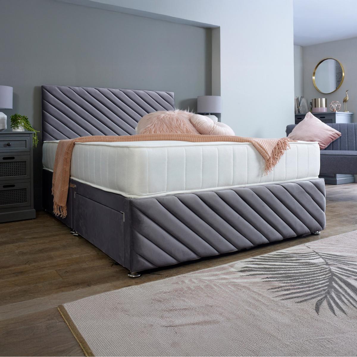 The luxurious Tokyo Divan Bed showcases the finest British craftsmanship, made with precision and care ensuring lost lasting quality. This Divan Bed features a stylish stripe design throughout the matching headboard and footboard adding a touch of class to any bedroom. Designed to pair seamlessly with your preferred mattress, allowing you to create the perfect sleep sanctuary. Crafted with the finest material, the bed boasts durability, comfort, promising years of restful night's sleep. Elevate your bedroom with the perfect blend of elegance, style and quality. Transform your space into a haven of comfort and sophistication with a range of beautiful colours to choose from.