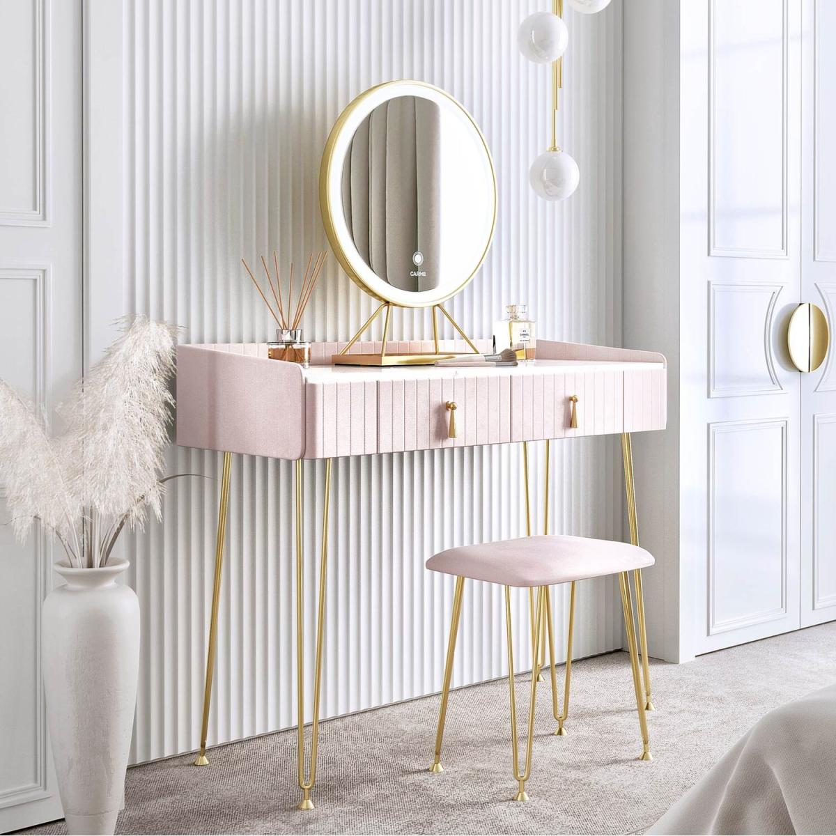 Make a style statement with the Tokyo Glow. From the Velvet Collection this dressing table is the perfect focal point for your dressing room or bedroom. The striped fabric adds a pop of colour and contrasts perfectly against the white marble effect table top. Complete with two storage drawers, decorated with gold handles which complement the sleek gold hair pin legs on the dressing table and matching padded stool. Completing the Tokyo Glow is a table top mirror, crafted in gold with a minimalistic design the round mirror is illuminated with an LED light. Controlled by a touch sensor, effortlessly adjust the brightness and choose from the three colour light settings, cool, warm and daylight to make sure you get the perfect glow. Make a style statement with the Tokyo Glow. From the Velvet Collection this dressing table is the perfect focal point for your dressing room or bedroom. The ballerina pink quilted patterned fabric adds a pop of colour and contrasts perfectly against the white marble effect tabletop. Complete with two storage drawers, decorated with gold handles which complement the sleek gold hair pin legs on the dressing table and matching padded stool. Completing the Tokyo Glow is a tabletop mirror, crafted in gold with a minimalistic design the round mirror is illuminated with an LED light. Controlled by a touch sensor, effortlessly adjust the brightness, and choose from the three colour light settings, cool, warm and daylight to make sure you get the perfect glow. The removable mirror is available to buy separately.