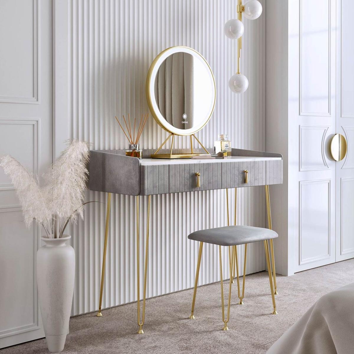 Make a style statement with the Tokyo Glow. From the Velvet Collection this dressing table is the perfect focal point for your dressing room or bedroom. The striped fabric adds a pop of colour and contrasts perfectly against the white marble effect table top. Complete with two storage drawers, decorated with gold handles which complement the sleek gold hair pin legs on the dressing table and matching padded stool. Completing the Tokyo Glow is a table top mirror, crafted in gold with a minimalistic design the round mirror is illuminated with an LED light. Controlled by a touch sensor, effortlessly adjust the brightness and choose from the three colour light settings, cool, warm and daylight to make sure you get the perfect glow. The Tokyo Glow dressing table is rectangular in shape and larger in size, making it the perfect statement feature for your bedroom or dressing room. She has two spacious drawers for storage, with both drawers featuring a champagne gold tassel effect handle. The hairpin legs and circular mirror are matching in gold, and the mirror is removable and has a dimmable LED light. The LED has three different colour settings to suit your glow requirements, whether that be warm, day or cool, read our lighting guide on how to choose your perfect light setting for applying makeup. The finishing touches include a white marble effect tabletop and a complimentary stool with matching gold hairpin legs and velvet seat cover. Add a pop of colour and give your friends and family dressing table envy with the Tokyo Glow dressing table, available in Raspberry, a very subtle pale pink, as well as Baby blue. Dressing table and mirror design registration number 6128019