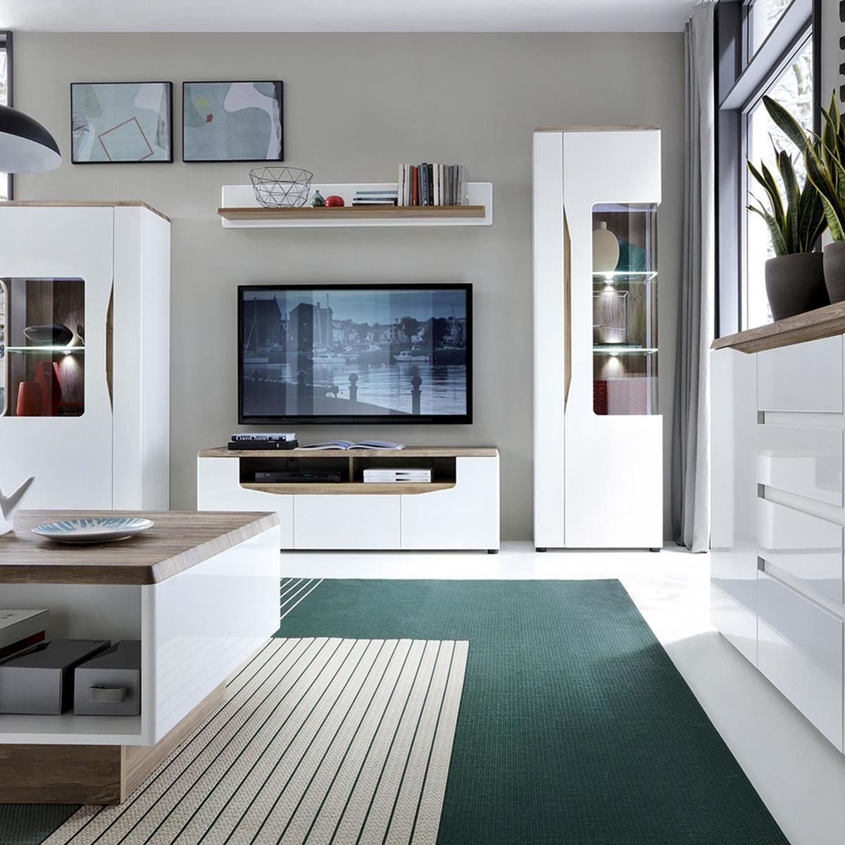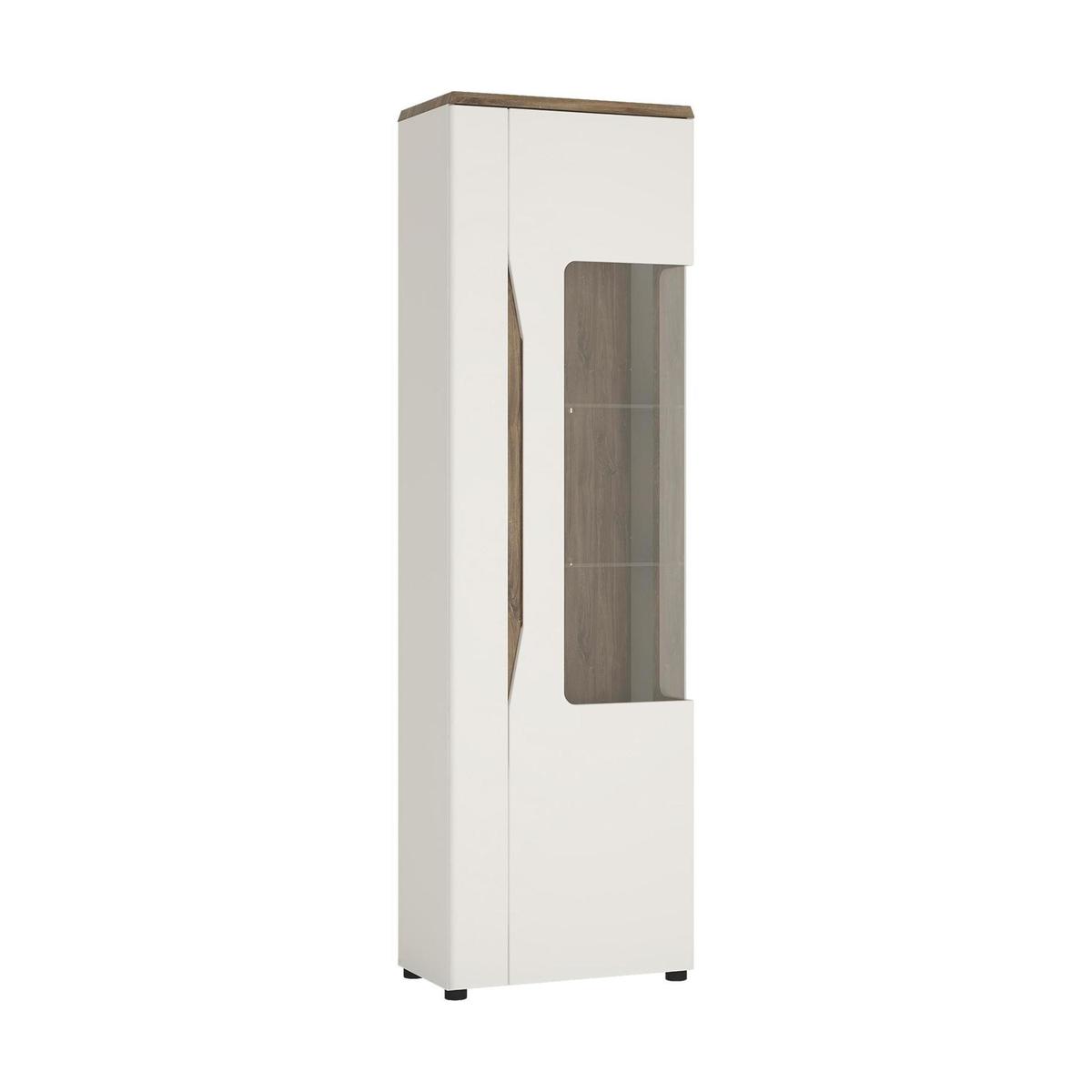 The Toledo 1 Door Right Hand Display Cabinet is a great display unit with plenty of room for storage. This modern display cabinet features adjustable and soft closing hinges on all doors and easy gliding runners, and thanks to the laminated finish it is also resistant to damage and scratches, moisture and high temperatures. The Toledo collection is perfect for lovers of bright and modern interiors. The combination of Alpine white with high gloss fronts and Stirling oak will provide you with a warm interior with a touch of harmony.\n\nPlease note, unfortunately we cannot deliver this item to the Channel Islands.\n\n[Click here to view the full Toledo range](https://www.dunelm.com/category/home-and-furniture/furniture/shop-by-collection/toledo-furniture-collection)