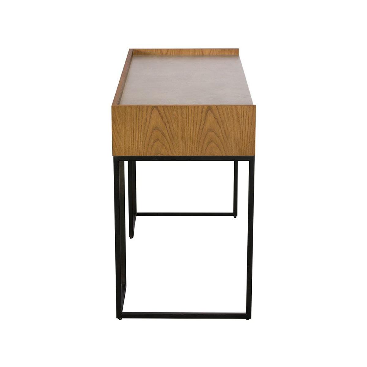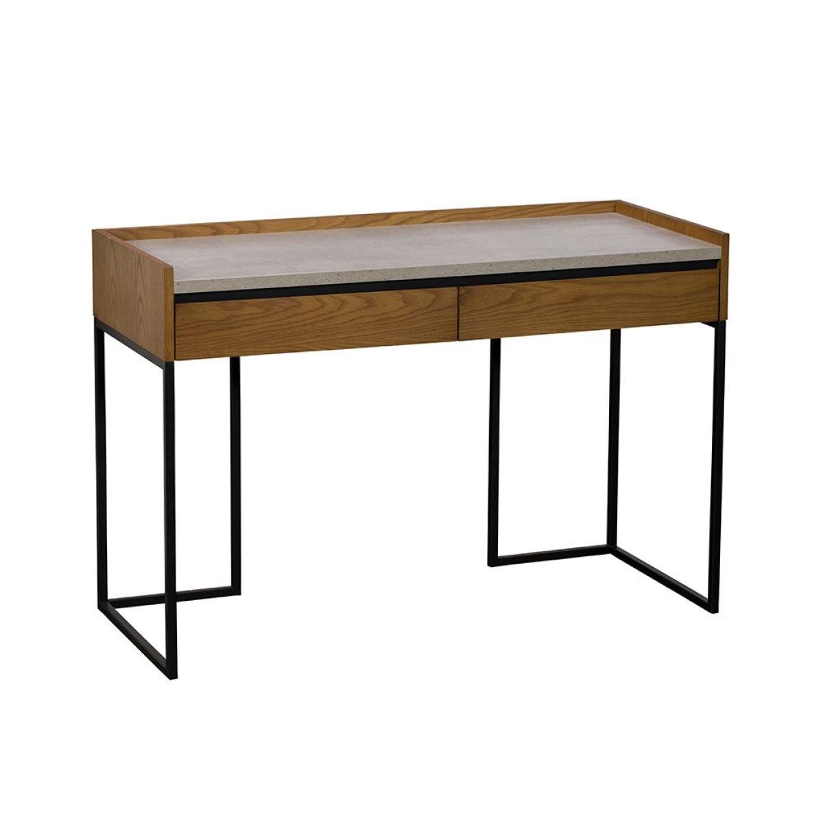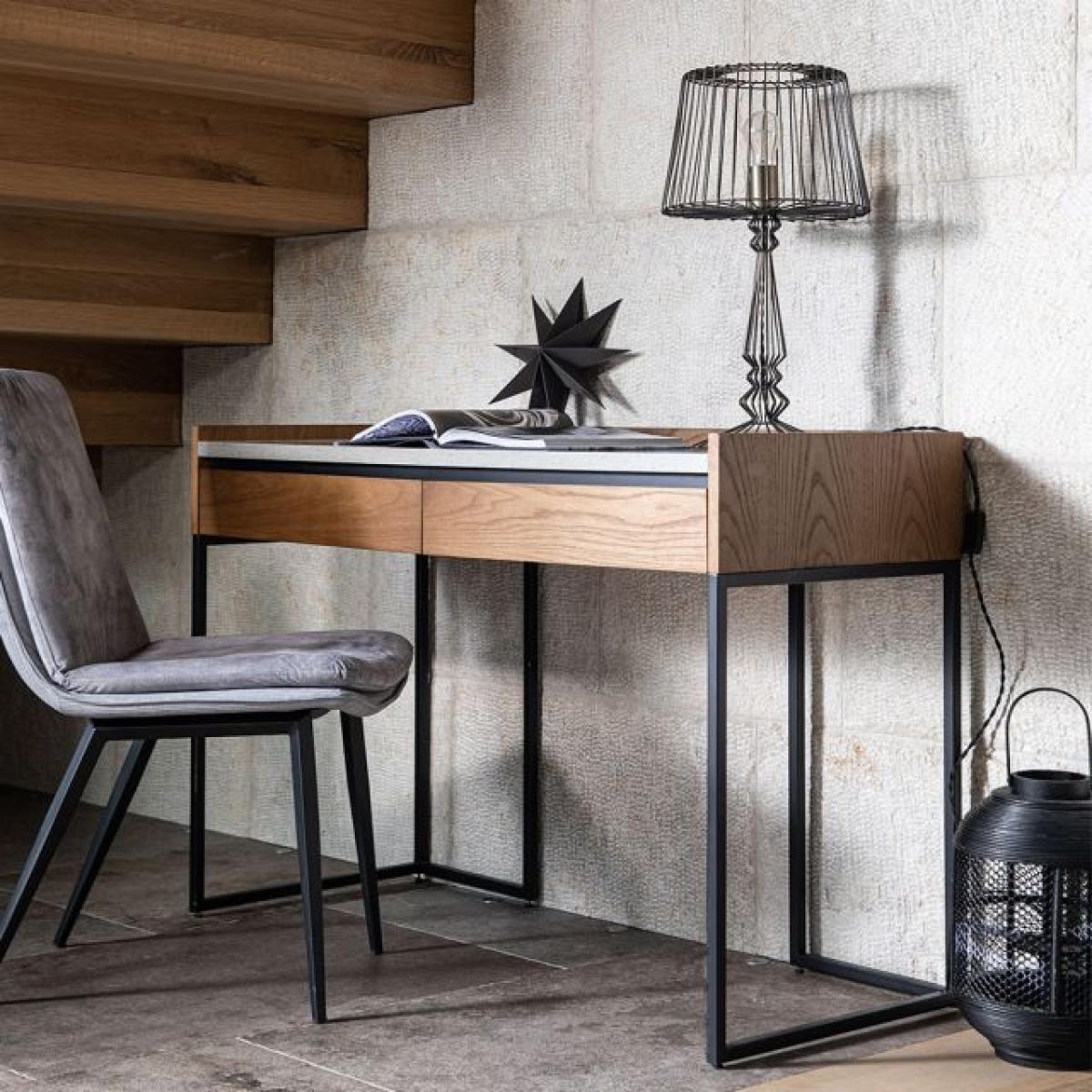 The Toledo Desk has sturdy black powder coated steel legs supporting contrasting with an oak veneer and grey writing surface wrapped in melamine typical of the stylish industrial Toledo range. It features two drawers for storing pens, paper and office equipment. Dimensions: H80cm x W120cm x D50cm. Durable, stain resistant top Steel legs. Simple self assembly