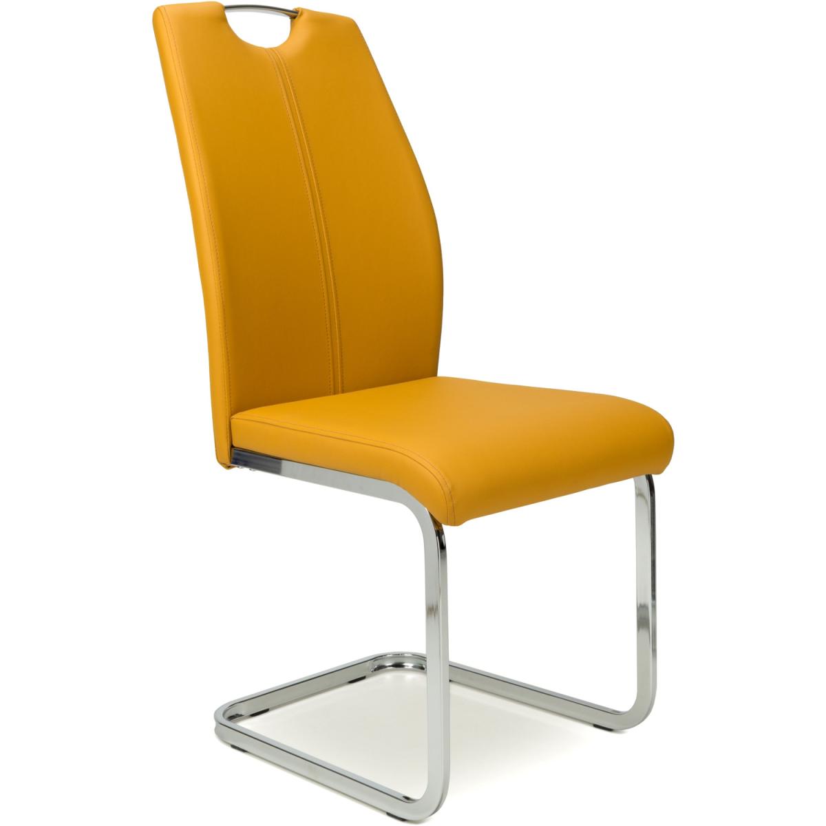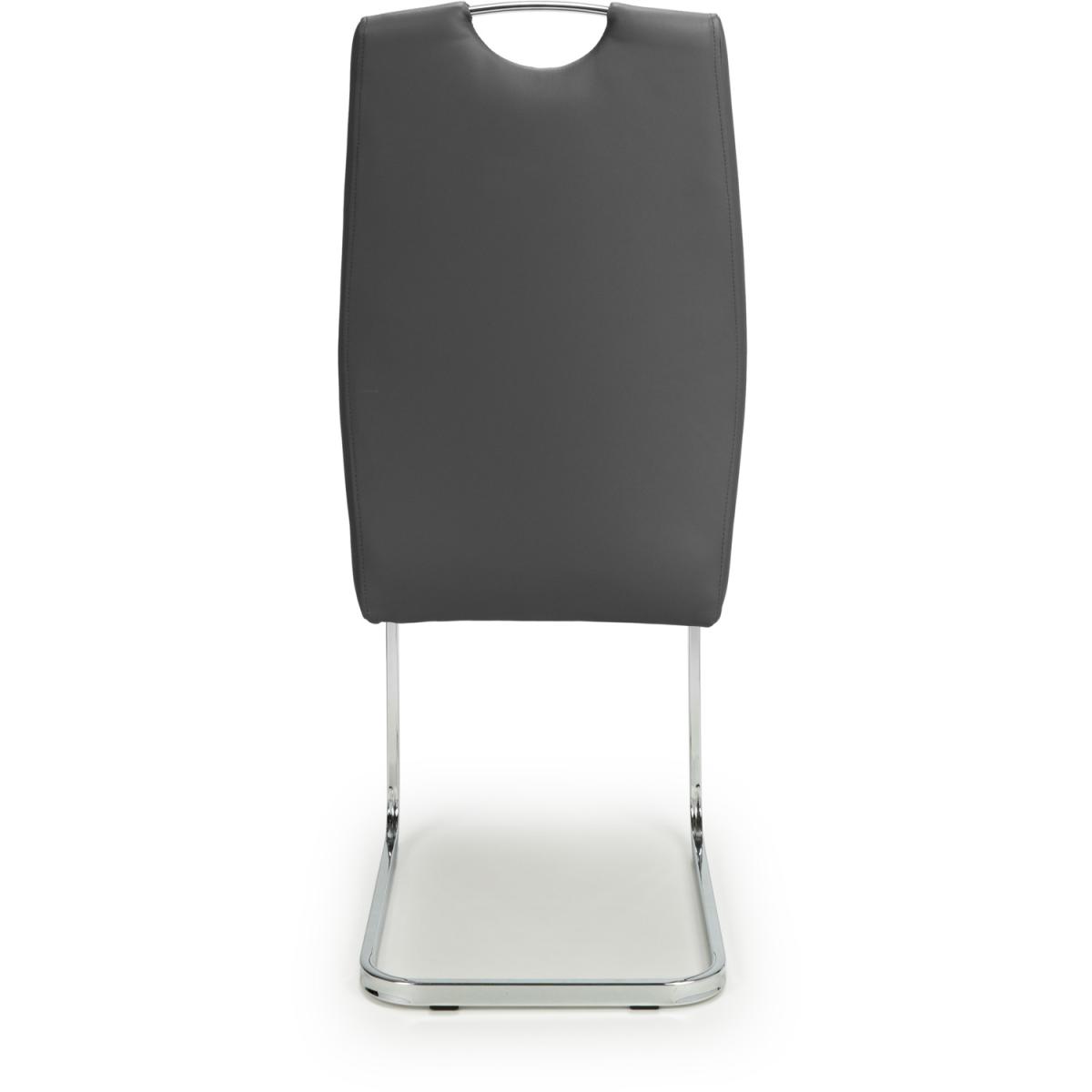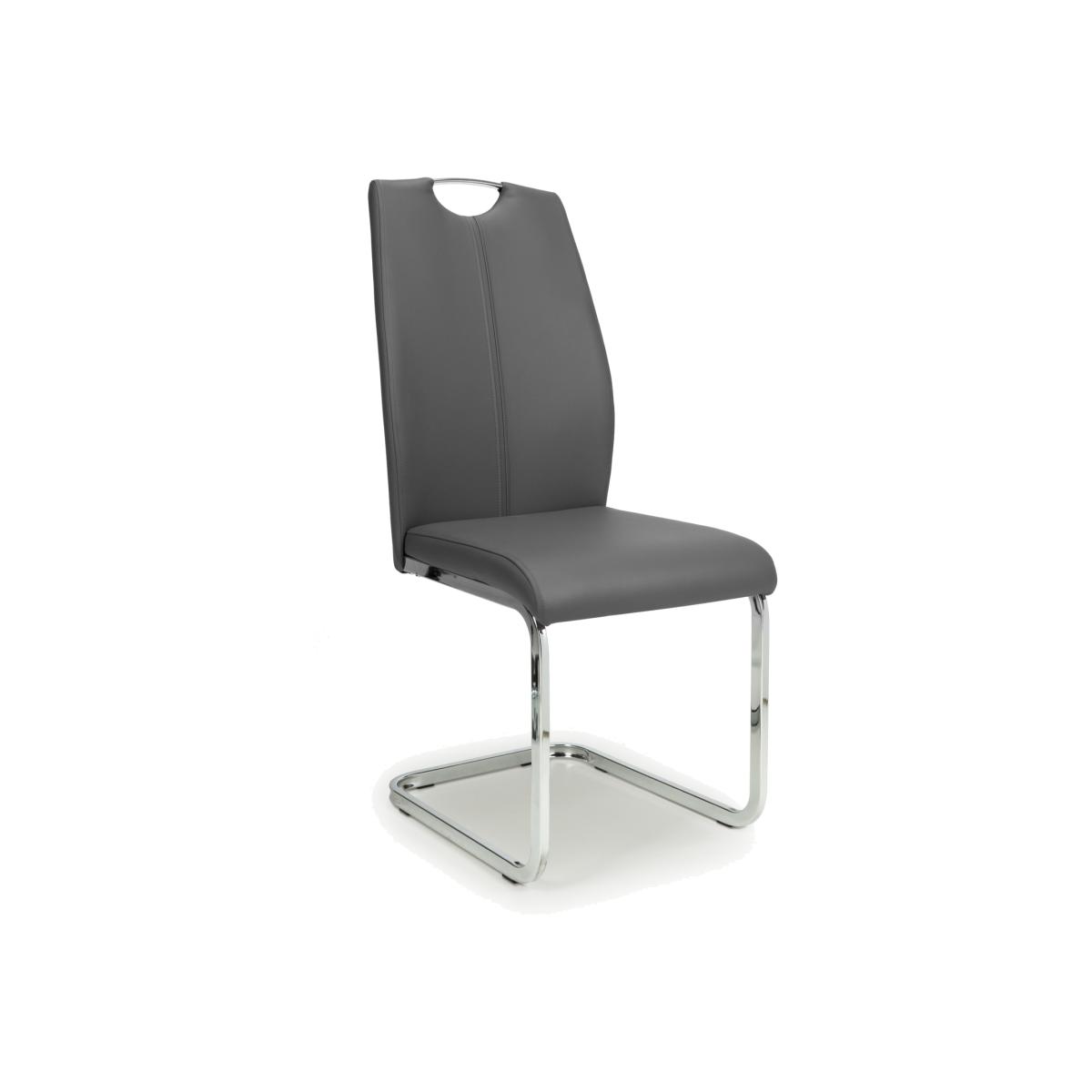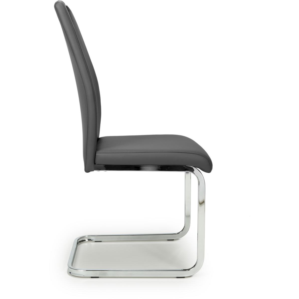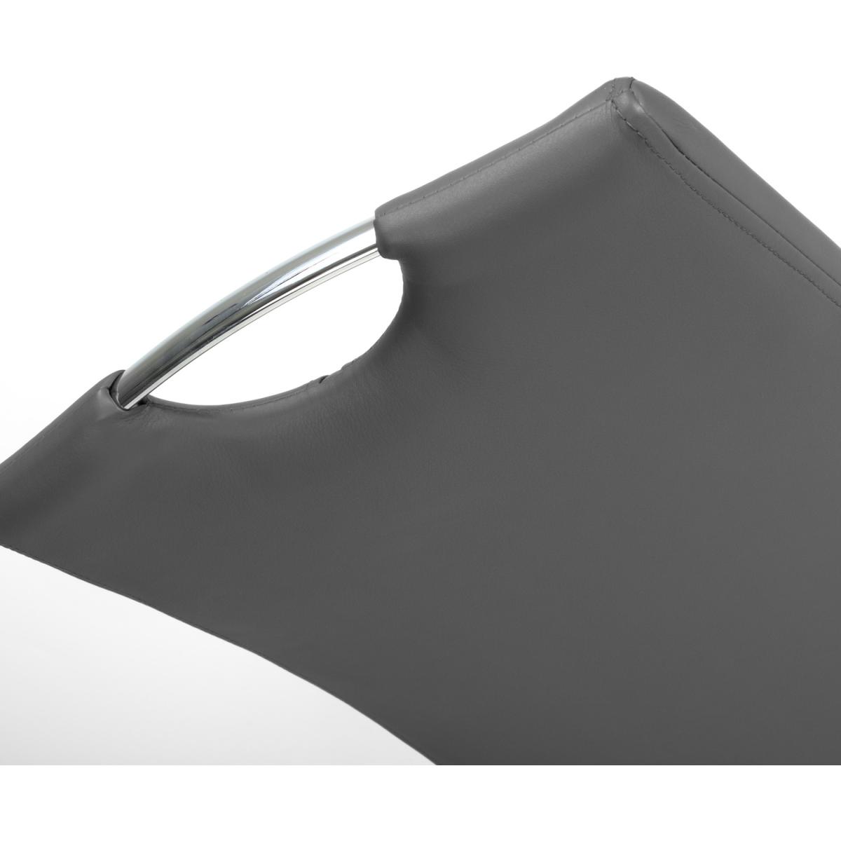 An attractive ergonomic curved back cantilever chair, upholstered in graphite grey leather effect. The back features a curved chrome handle at the top, with vertical stripe stitching. Fitted with chrome cantilever legs. Assembly required. Sold in boxes of 4.