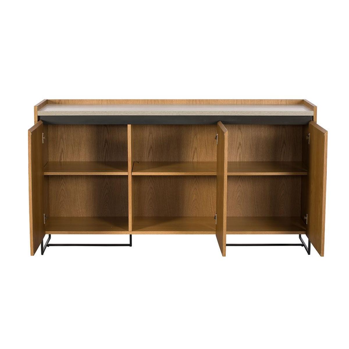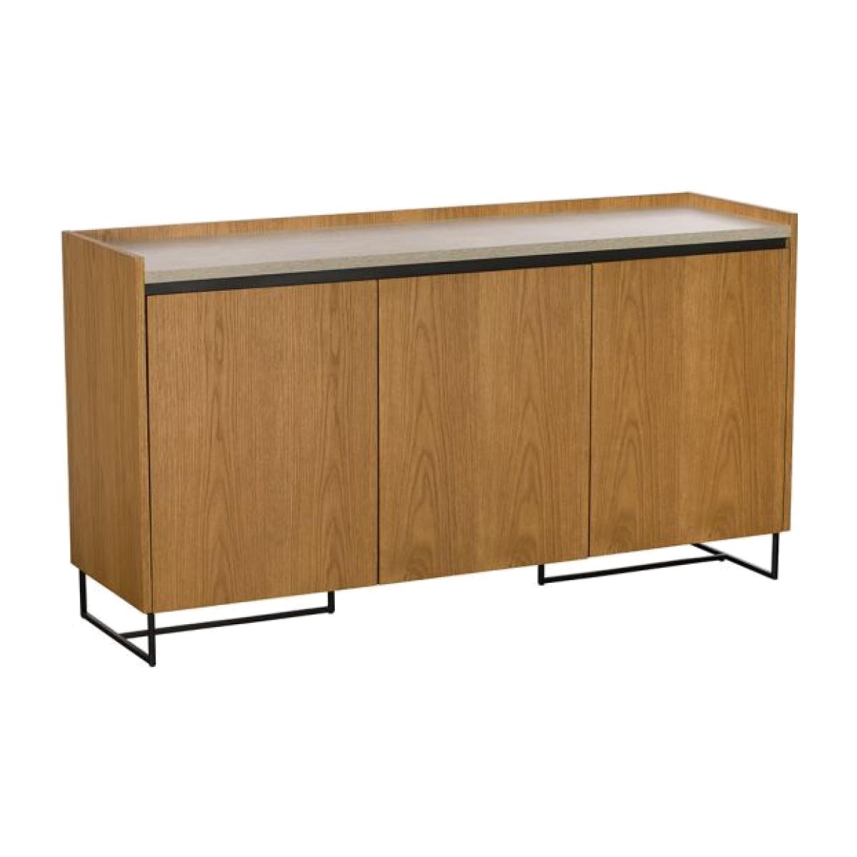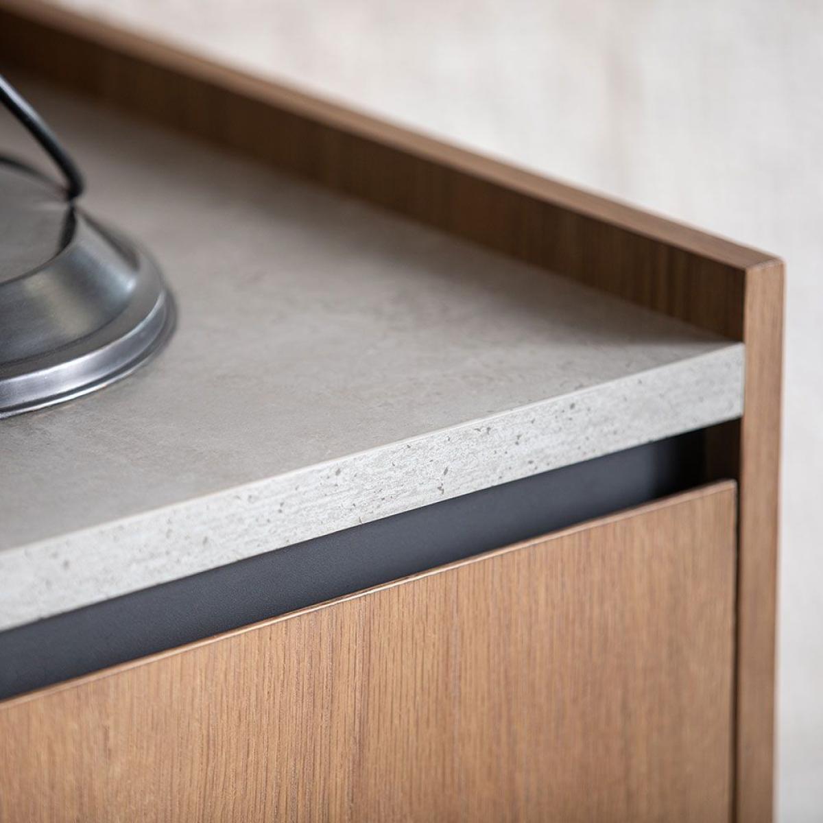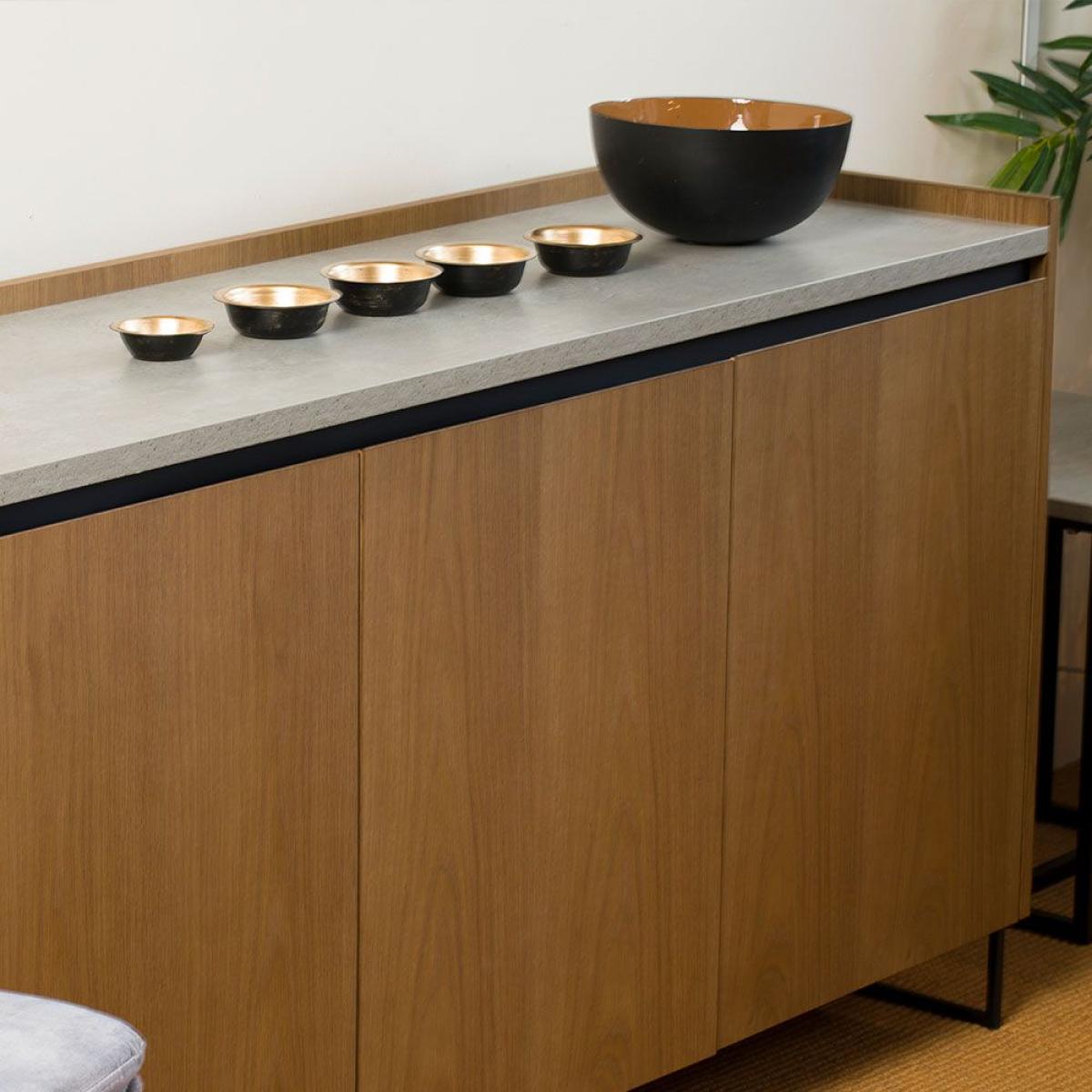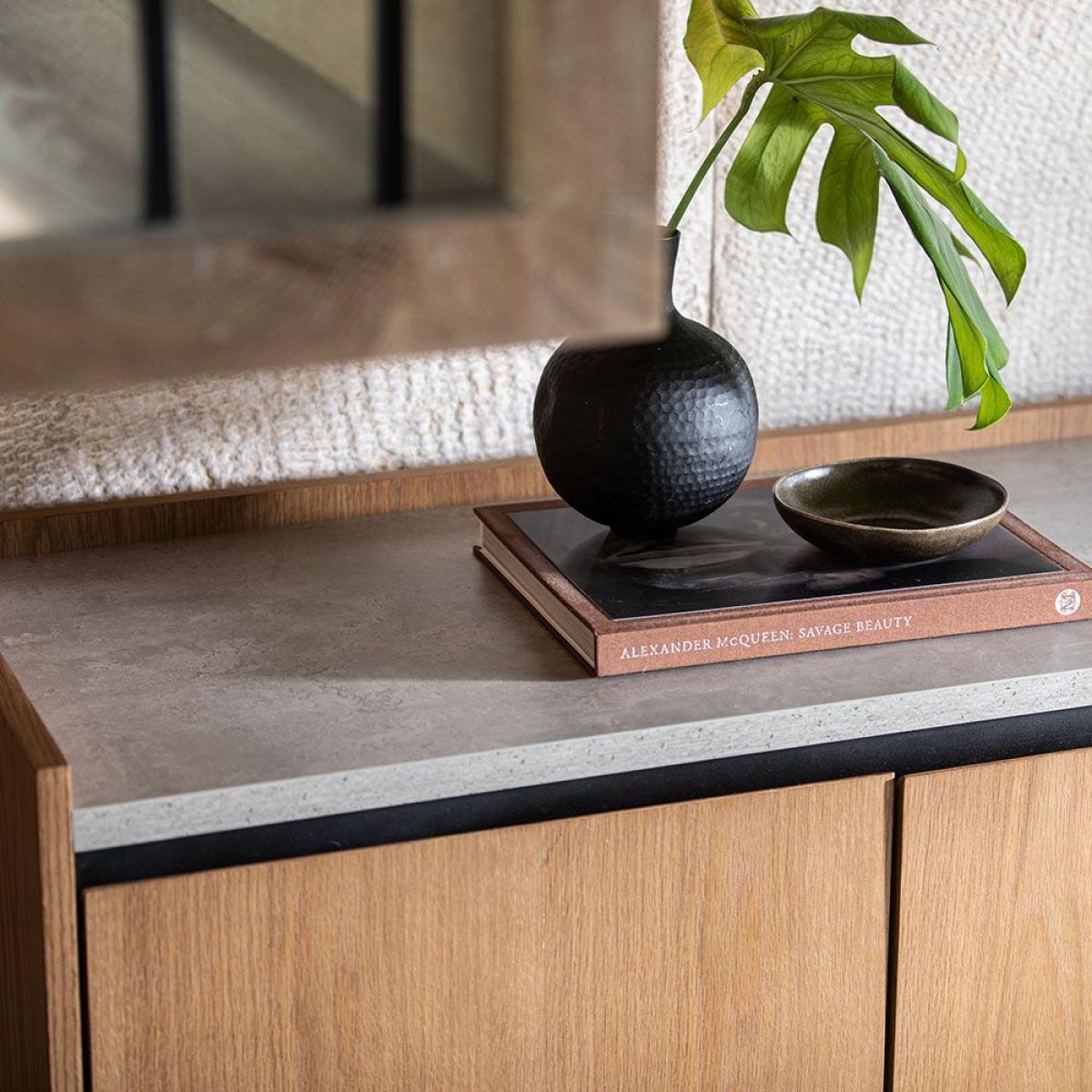 This Toledo sleek sideboard has a generous amount of space for storing tableware and many items needed for dining or the living room. It has a durable grey surface with perfectly contrasting oak veneer doors and sides and sturdy yet minimal black coated steel legs. Complete the look and match with other pieces in the Toledo range.