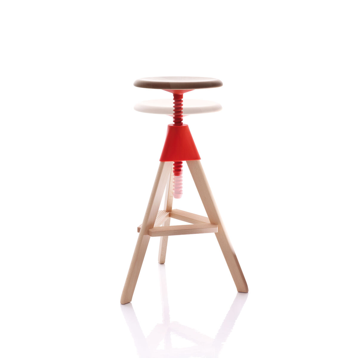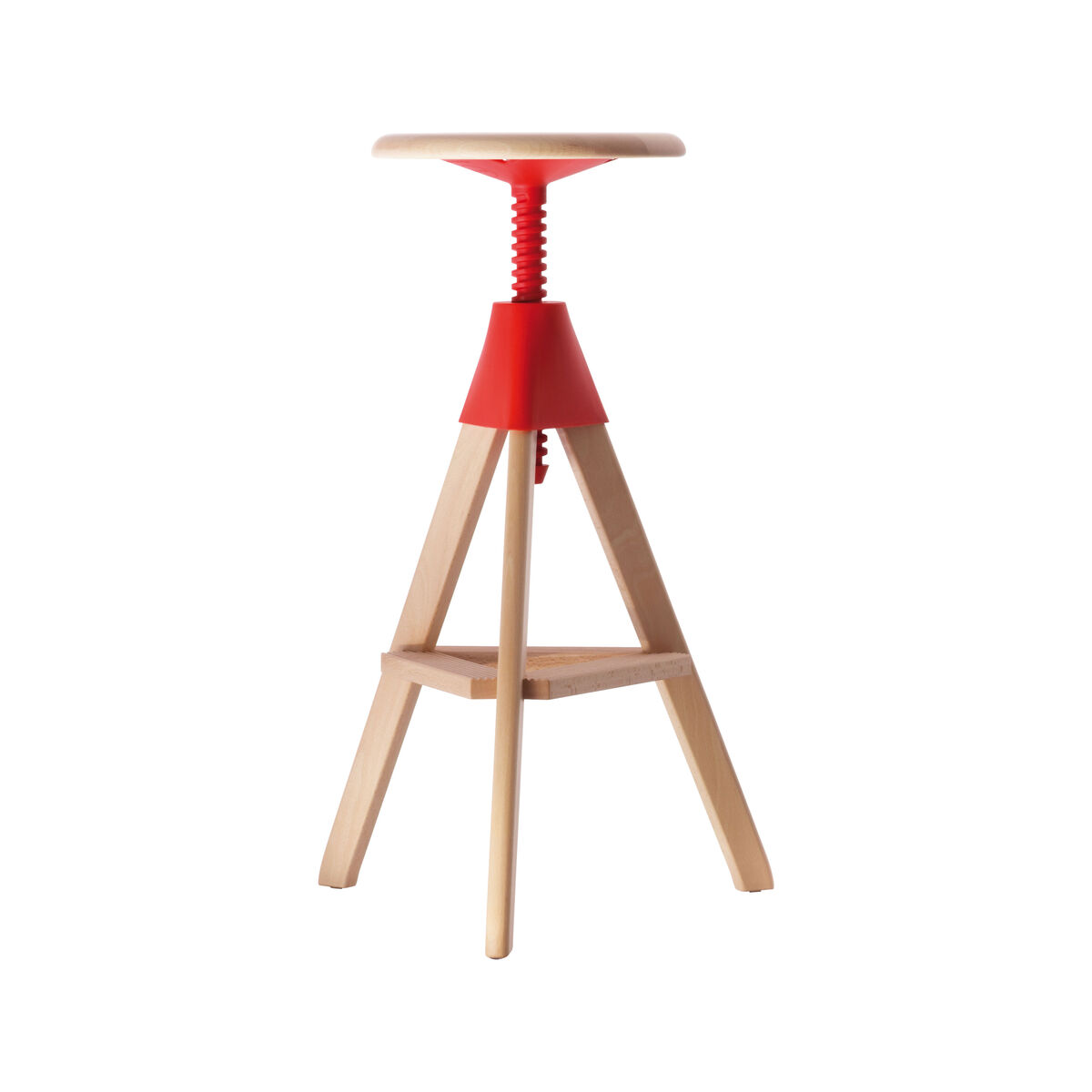 TOM & JERRY is the redesign of a classic furniture typology: the workshop stool. The three-legged stool (in two different heights) is made of solid beech wood with mechanical parts in self lubricant plastic. Due to its smooth-running mechanism it is easy to adjust and convenient to climb. The stools make a versatile addition to working, recreational and private environments alike: an office canteen, the health food restaurant or the kitchen counter at home. It's the working stool of an architect or a scientist, the resting place of a museum guard, telephone stool, valet in a changing room, seating for children at kindergarden.
