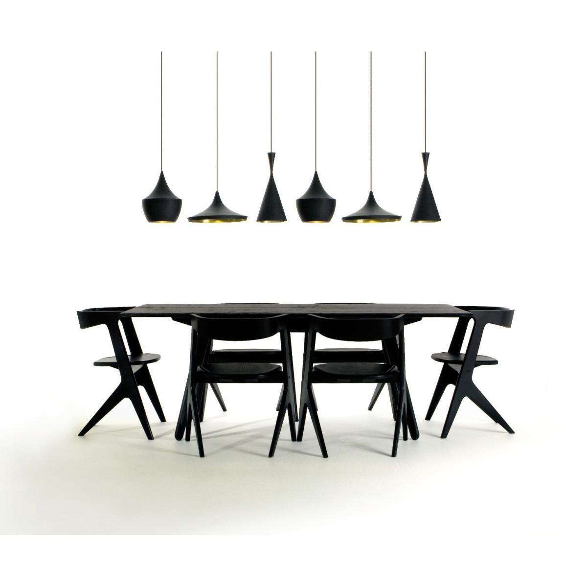 Beat is an extraordinary linear chandelier featuring two Beat Tall, two Beat Fat and two Beat Wide ceiling lights. Each Beat light is made from hand spun brass sculpted by artisan craftsmen in Northern India. The creation of the Beat light is part of an ancient process that takes four days to complete and its beaten interior is re-purposed to refract and reflect a soft and warm luminosity.