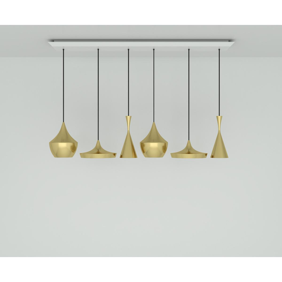 Beat is an extraordinary linear chandelier featuring two Beat Tall, two Beat Fat and two Beat Wide ceiling lights. Each Beat light is made from hand spun brass sculpted by artisan craftsmen in Northern India. The creation of the Beat light is part of an ancient process that takes four days to complete and its beaten interior is re-purposed to refract and reflect a soft and warm luminosity.