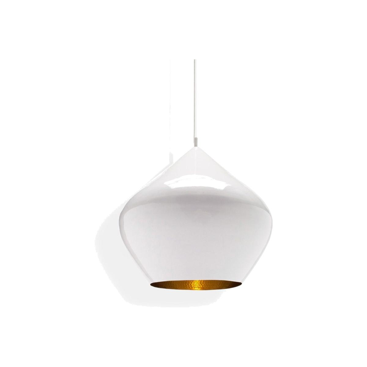 Beat Stout is a large glossy white ceiling light which features a contrasting warm, golden interior. Made from hand spun brass sculpted by artisan craftsmen in Northern India, the creation of this Beat light is part of an ancient process that takes four days to complete. The beaten interior is re-purposed to refract and reflect a soft and warm luminosity and the architectural scale gives off a greater light output.