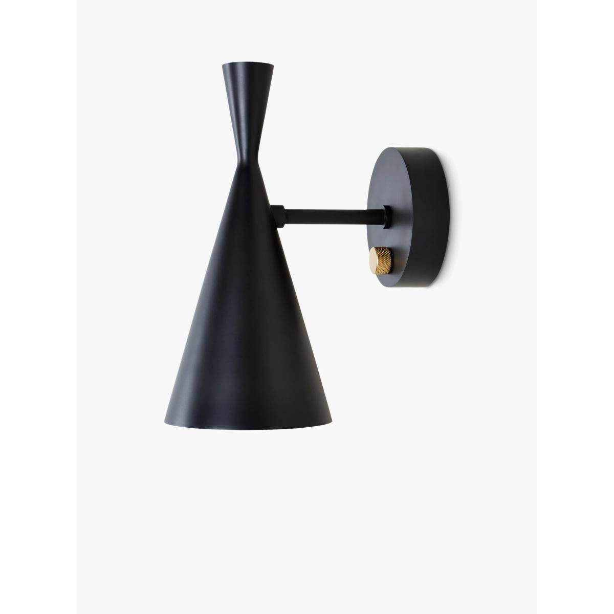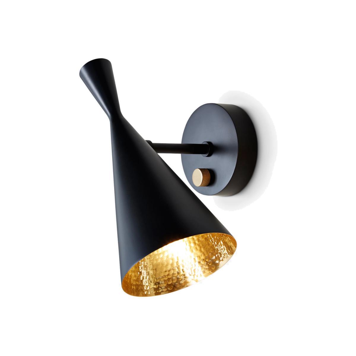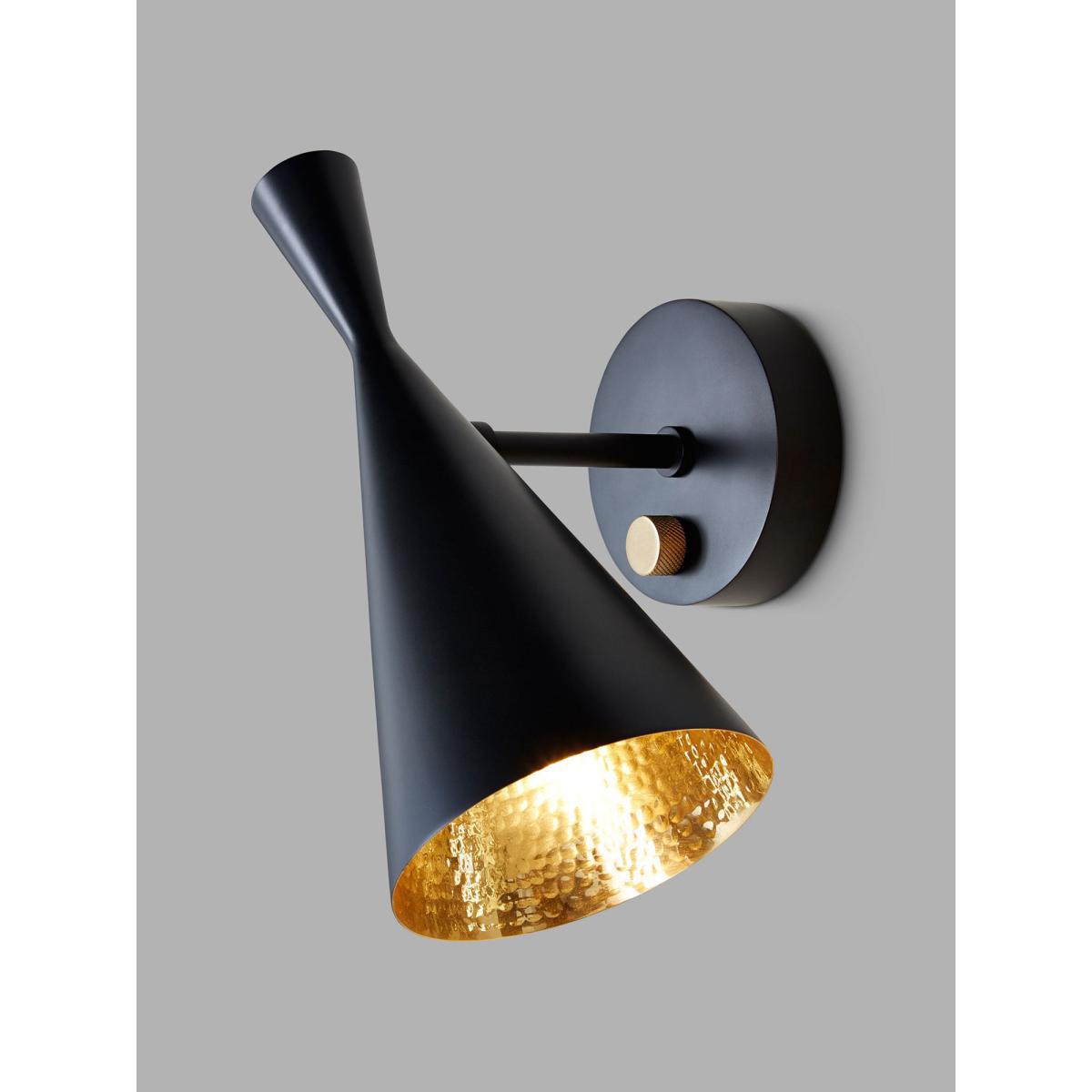 The Beat lighting range from Tom Dixon has been crafted and hand-beaten by experienced artisans in Moradabad, Northern India. Designed with a lacquered gloss white, or matt powder-coated black exterior, this single arm wall light has a striking golden interior that emanates a warm glow when lit. It also features a solid brass dimmer dial so that you can direct the exact amount of light you need.