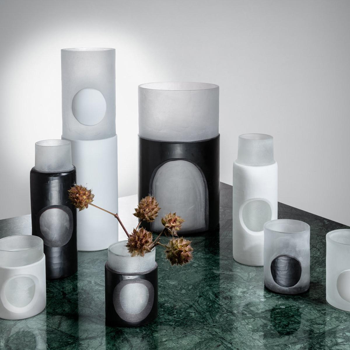 Make an impact with this Carved vase from Tom Dixon. Chunky yet ethereal, this vase is crafted from double layered mouth-blown glass that has been expertly carved to define a series of circular motifs. Pair it with more pieces from the Carved collection for a dramatic look.