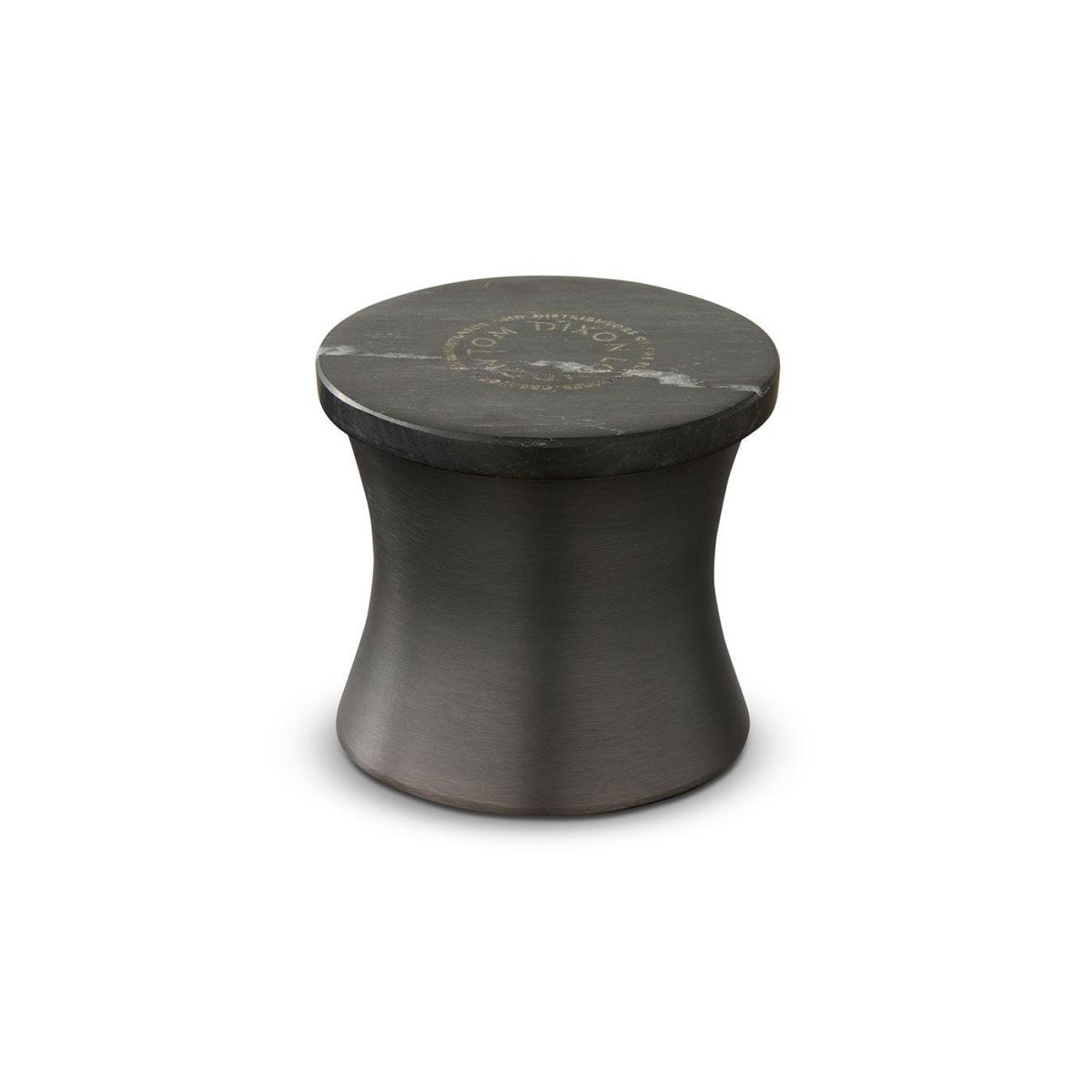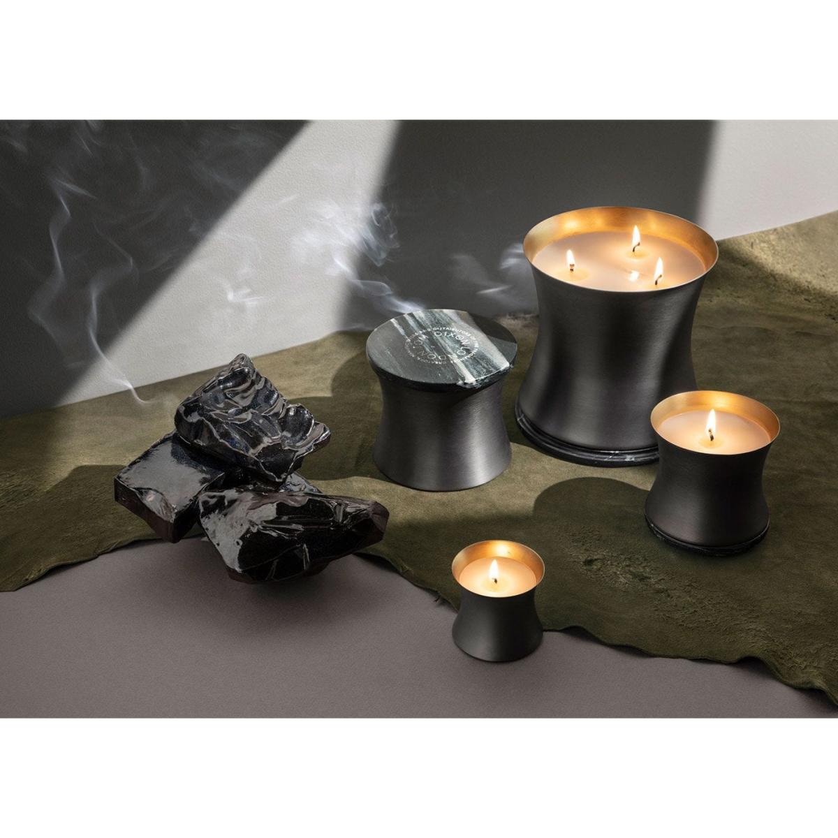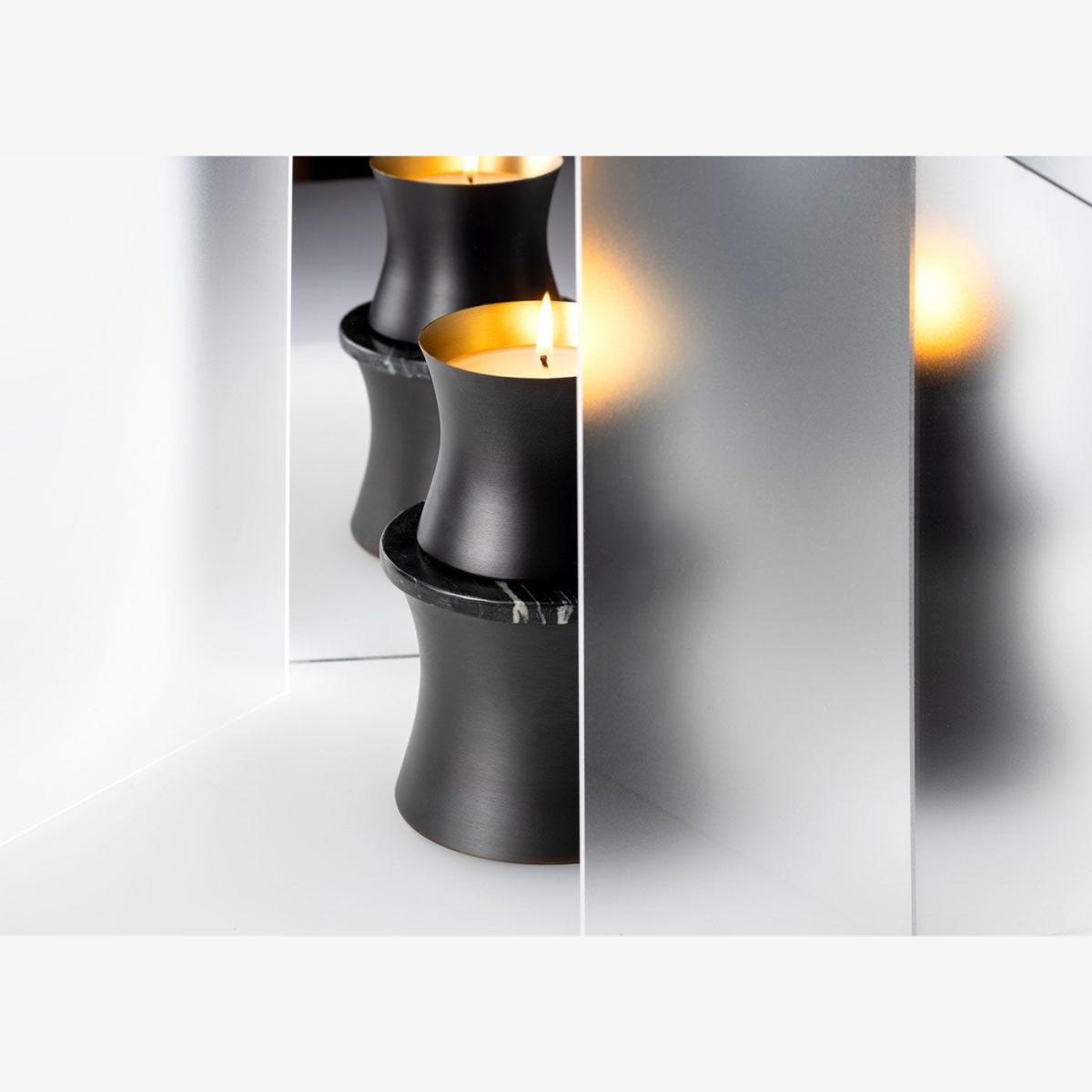 Alchemy; influenced by the endless search to transform basic materials into a valuable substance, sharp black pepper, woody cypress, eucalyptus, exotic patchouli and smoky guaiac wood combine to create a precious perfume. This candle is encased in a hand-spun matte black vessel with a black marble lid which is designed with the intention for a second life - to be reused as a contemporary home accessory that lasts a lifetime.