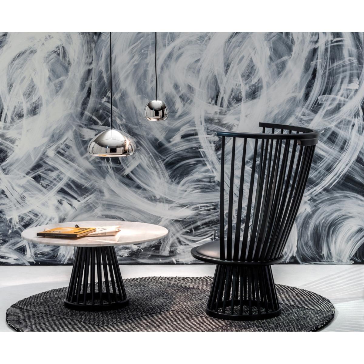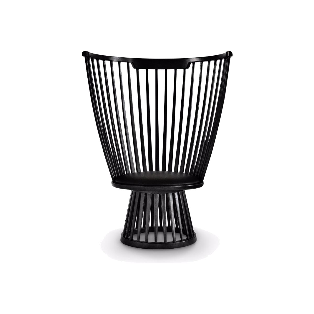 Originally a dramatic and sculptural take on a British design classic, Fan is available as a high back chair, dining chair, stool and table. The stools and chairs have a black leather seat pad, while the chairs feature a curved back, offering support and comfort. The lounge chair is available in black or natural ash.