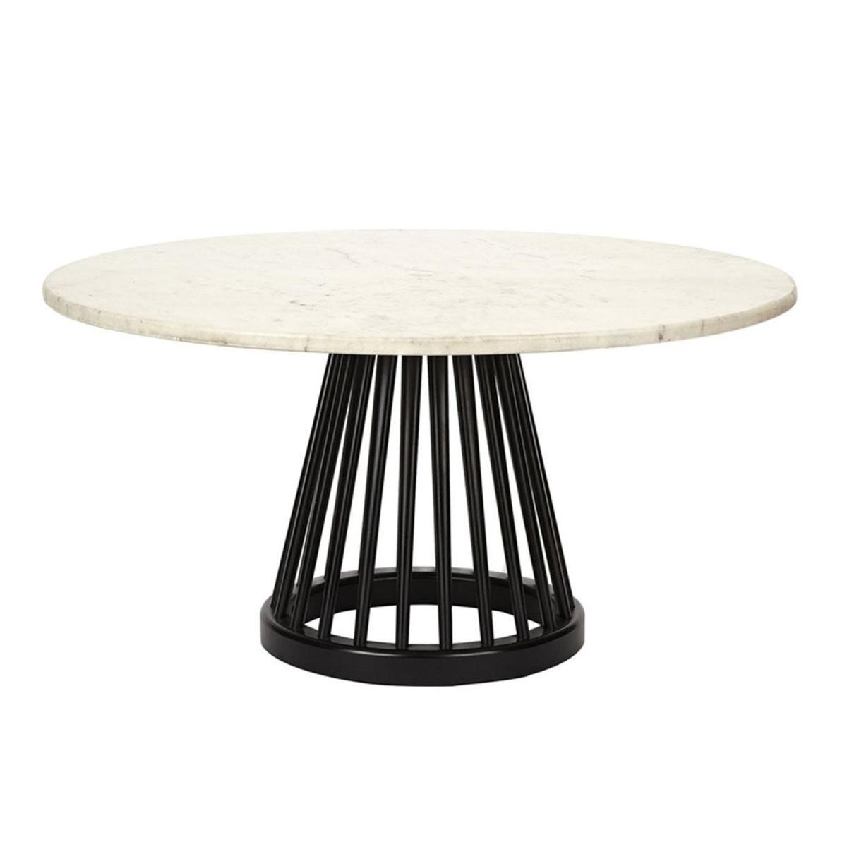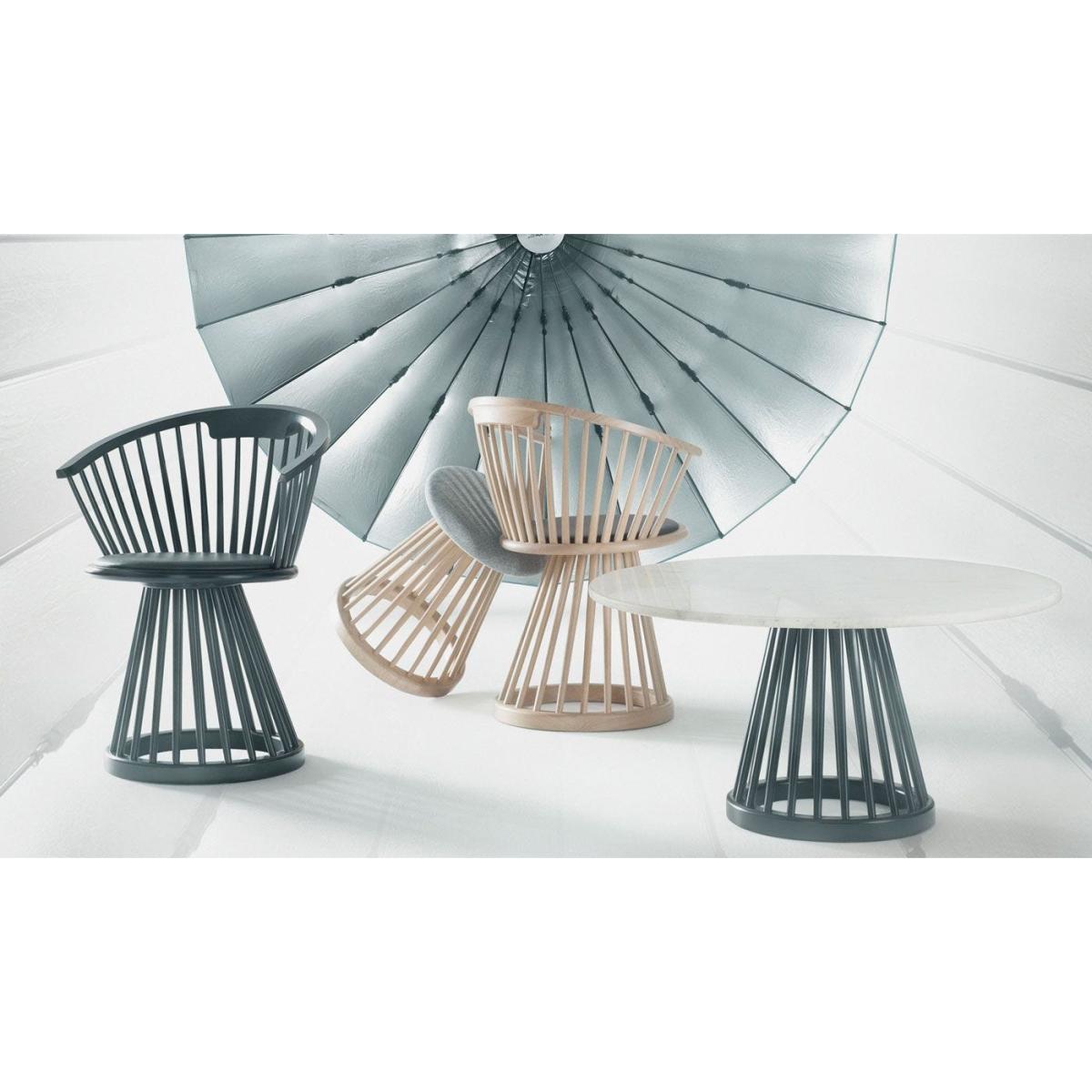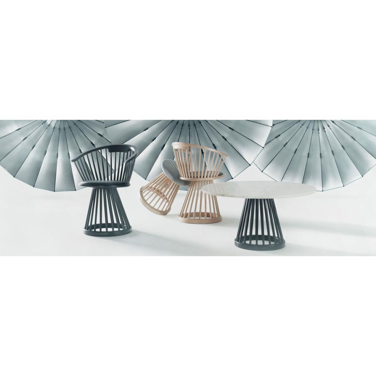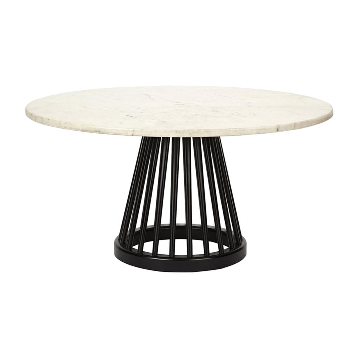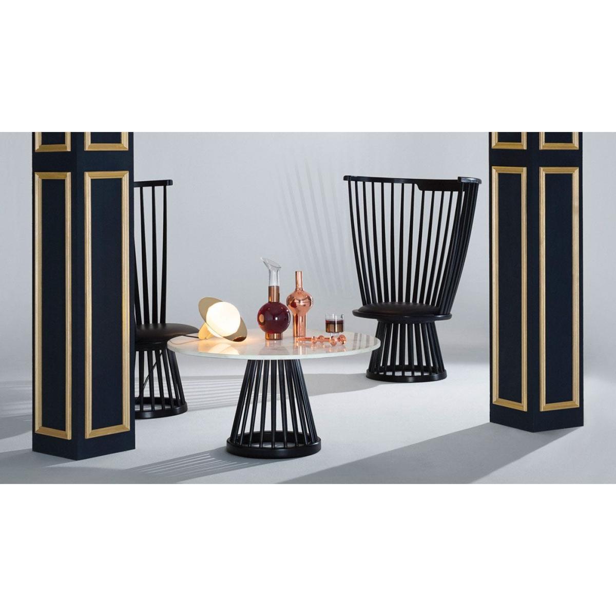 A dramatic and sculptural take on traditional British Windsor furniture, the Fan evokes the precision of Japanese design. Crafted from black birch, the distinctive profile of this table is thanks to the spindle construction on it conical base topped with a round slab of opulent white polished marble.