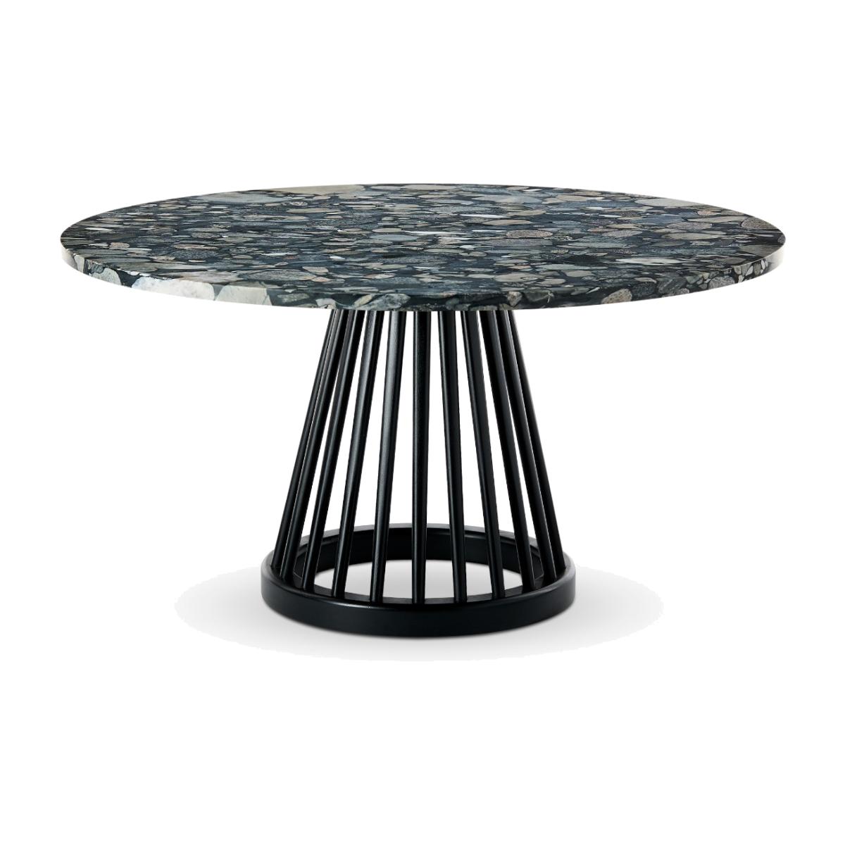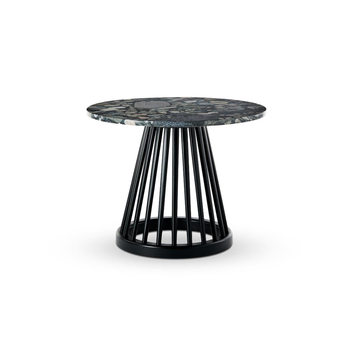 Fan is a modern take on the classical Windsor design. The round table is a British archetype converted to a contemporary silhouette, creating an exclamation mark in any space with a semi transparent structure that takes up minimal visual mass. Featuring a natural wooden base and a versatile and hardwearing round top in pebble marble.