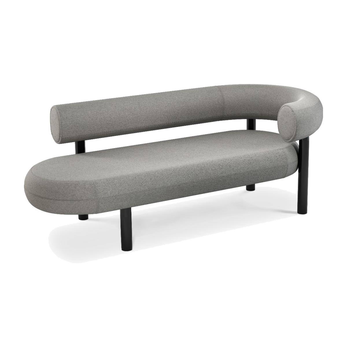Designed to hug the body and allowing for multiple sitting positions, this chaise longue is upholstered in Wool. Fat is made from moulded foam with a metal leg launching in high gloss black lacquer and made to order upholstery. Manufactured in Europe, hand finished and upholstered by experienced craftsmen.