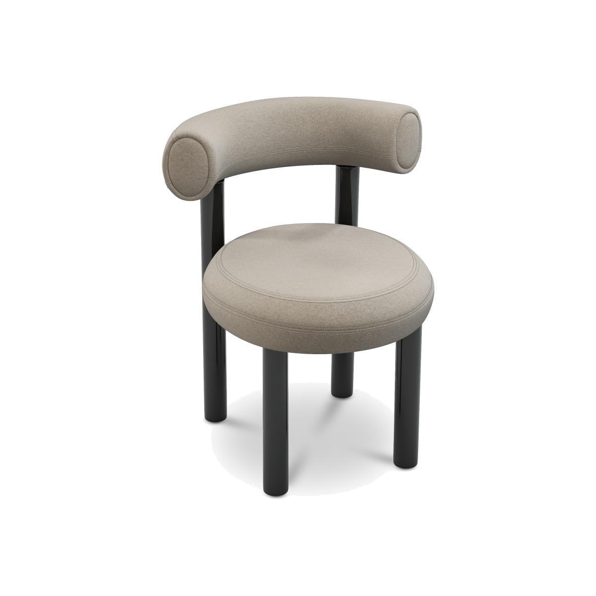 Designed to hug the body and allowing for multiple sitting positions, this dining chair is upholstered in Wool. Fat is made from moulded foam with a metal leg launching in high gloss black lacquer and made to order upholstery. Manufactured in Europe, hand finished and upholstered by experienced craftsmen.