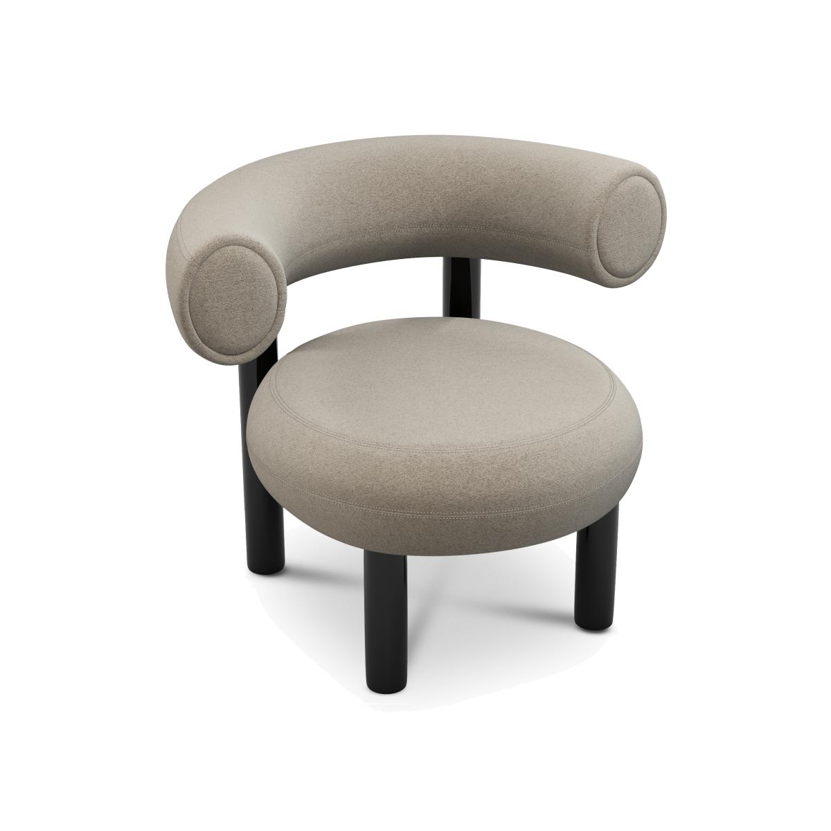 Designed to hug the body and allowing for multiple sitting positions, this lounge chair is upholstered in Wool. Fat is made from moulded foam with a metal leg launching in high gloss black lacquer and made to order upholstery. Manufactured in Europe, hand finished and upholstered by experienced craftsmen.