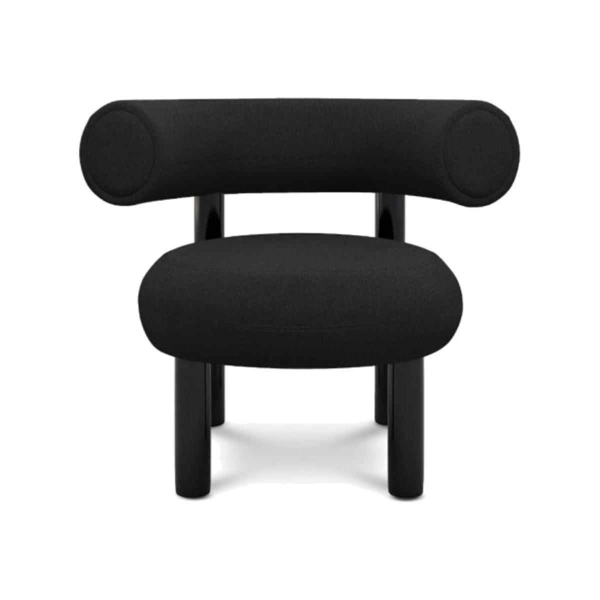 Designed to hug the body and allowing for multiple sitting positions, this lounge chair is upholstered using Kvadrat's black woollen fabric. Fat is made from moulded foam with a metal leg launching in high gloss black lacquer and made to order upholstery. Manufactured in Europe, hand finished and upholstered by experienced craftsmen. Dimensions: H: 70 x W: 72 x L: 82 cm Seat Height: 42cm Materials: Fabric, Foam, Plywood, MDF, Steel Assembly Required: No Care Instructions:Wipe with a clean, dry cloth. No harsh abrasives of cleaners