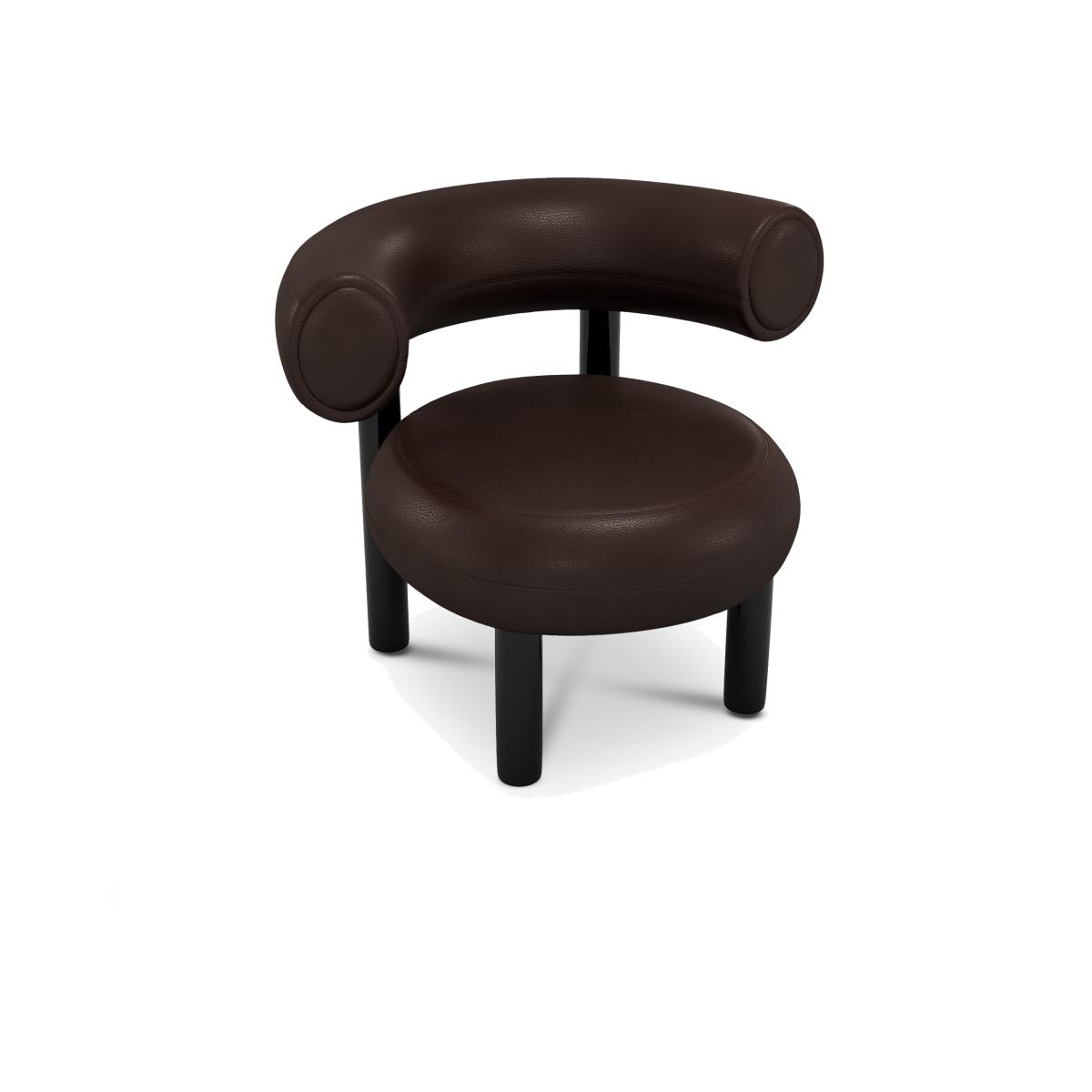 Designed to hug the body and allowing for multiple sitting positions, this lounge chair is upholstered using Sorensen's brown leather. Fat is made from moulded foam with a metal leg launching in high gloss black lacquer and made to order upholstery. Manufactured in Europe, hand finished and upholstered by experienced craftsmen.
