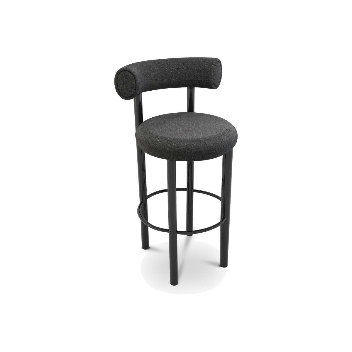 Designed to hug the body and allowing for multiple sitting positions, this stool is upholstered in Wool. Fat is made from moulded foam with a metal leg launching in high gloss black lacquer and made to order upholstery. Manufactured in Europe, hand finished and upholstered by experienced craftsmen.