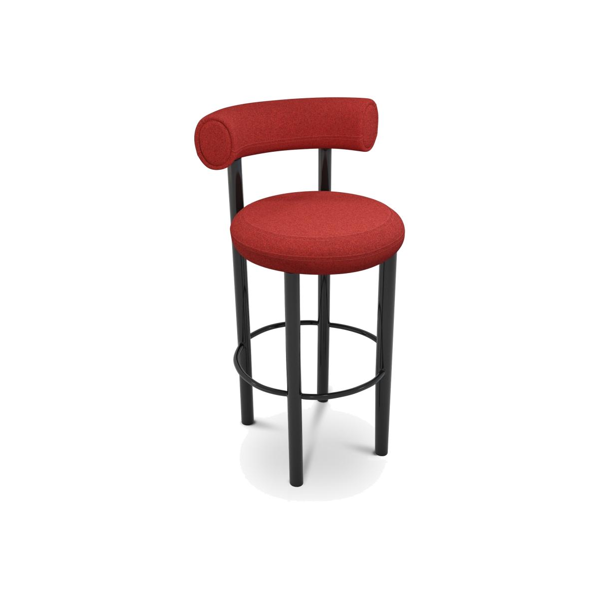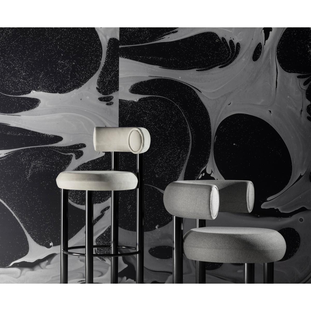 Designed to hug the body and allowing for multiple sitting positions, this stool is upholstered in Wool. Fat is made from moulded foam with a metal leg launching in high gloss black lacquer and made to order upholstery. Manufactured in Europe, hand finished and upholstered by experienced craftsmen.