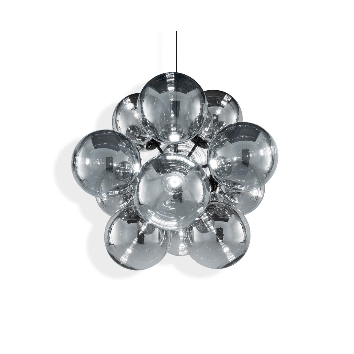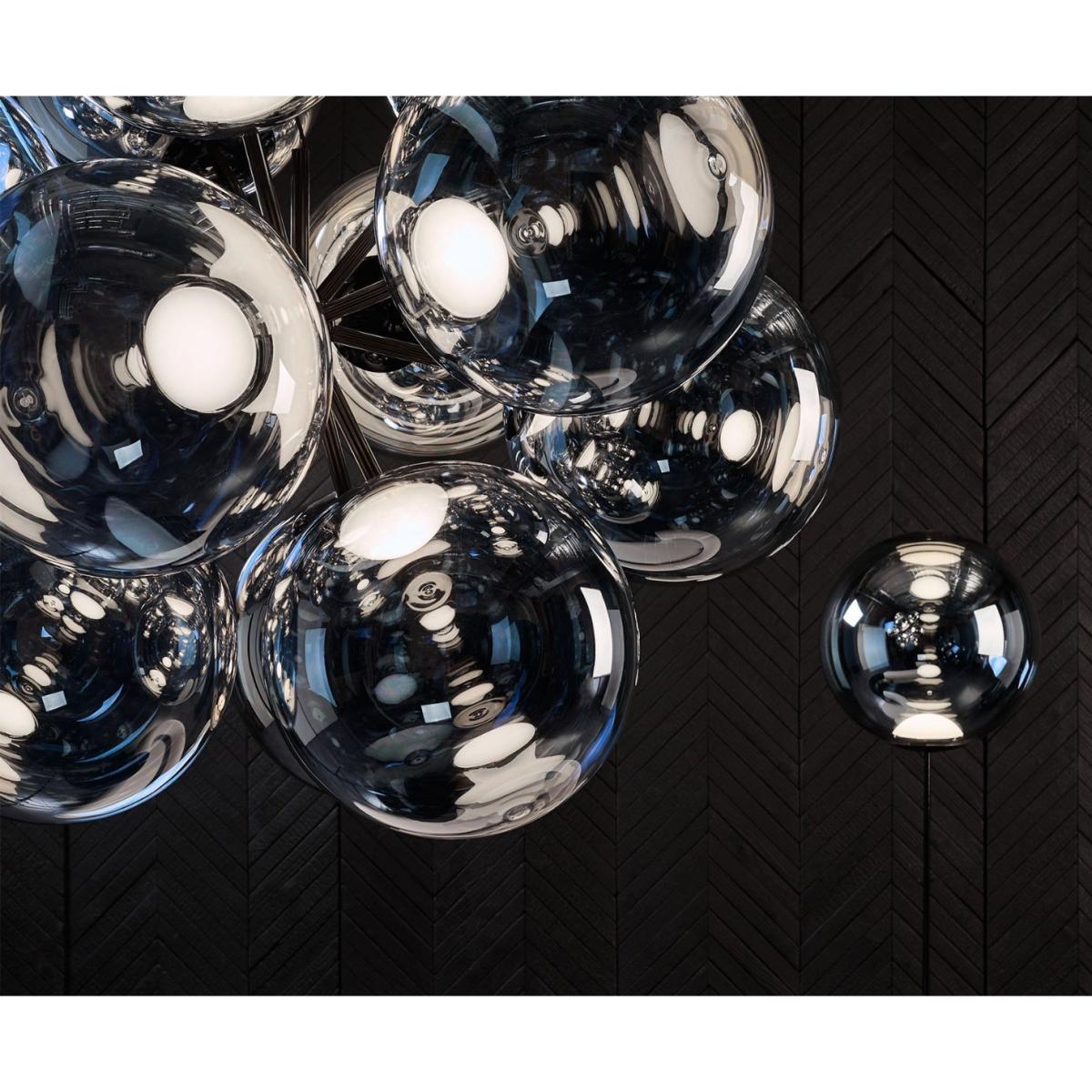 Globe Burst is an extraordinary large chandelier featuring 12 Globe shades with a gloss black fitting. The shades are designed into a fixed configuration with a single point construction. Featuring our integrated LED module, the spherical orbs are highly mirrored and perfectly reflective during the day, and when switched on reveals a multiplicity of internal reflections.