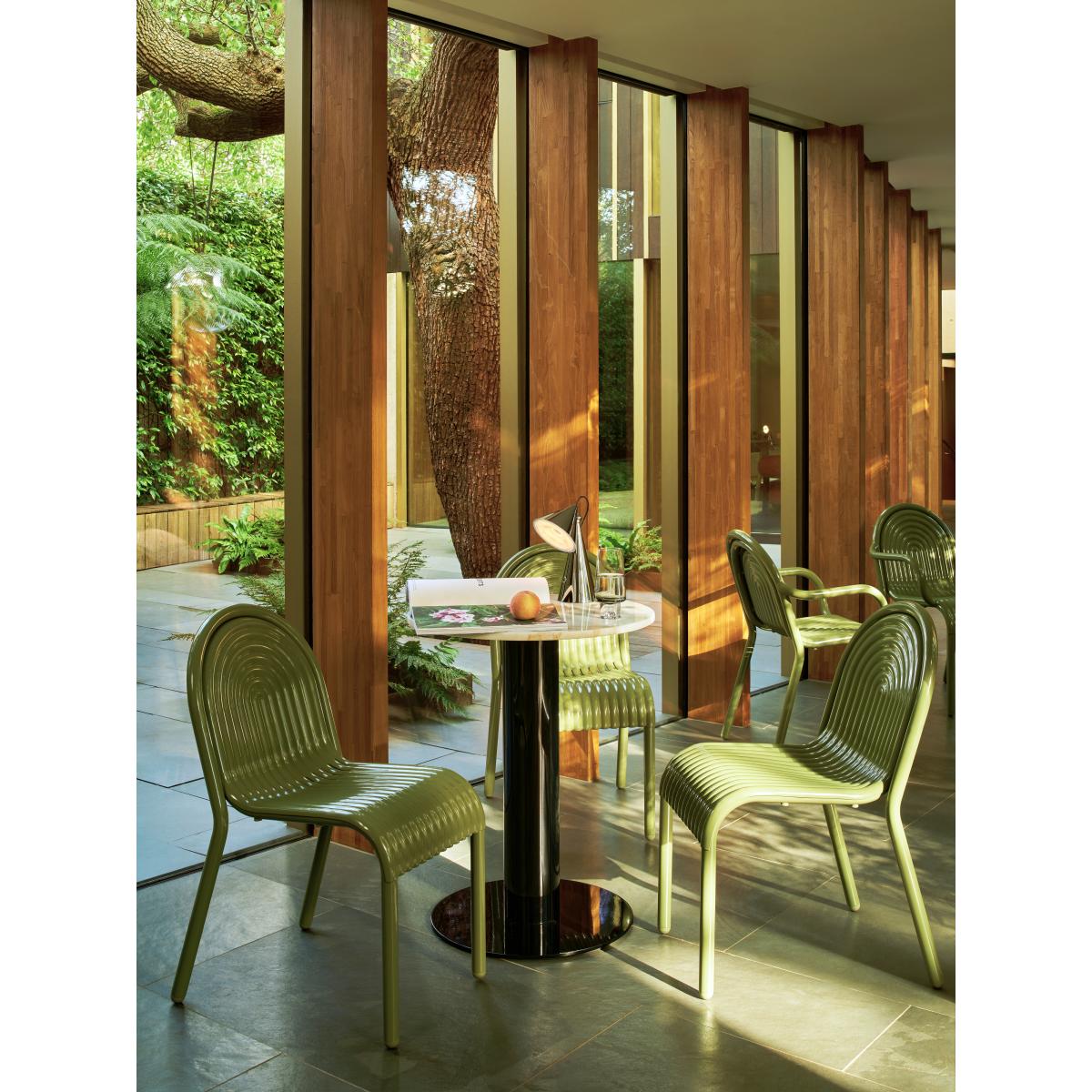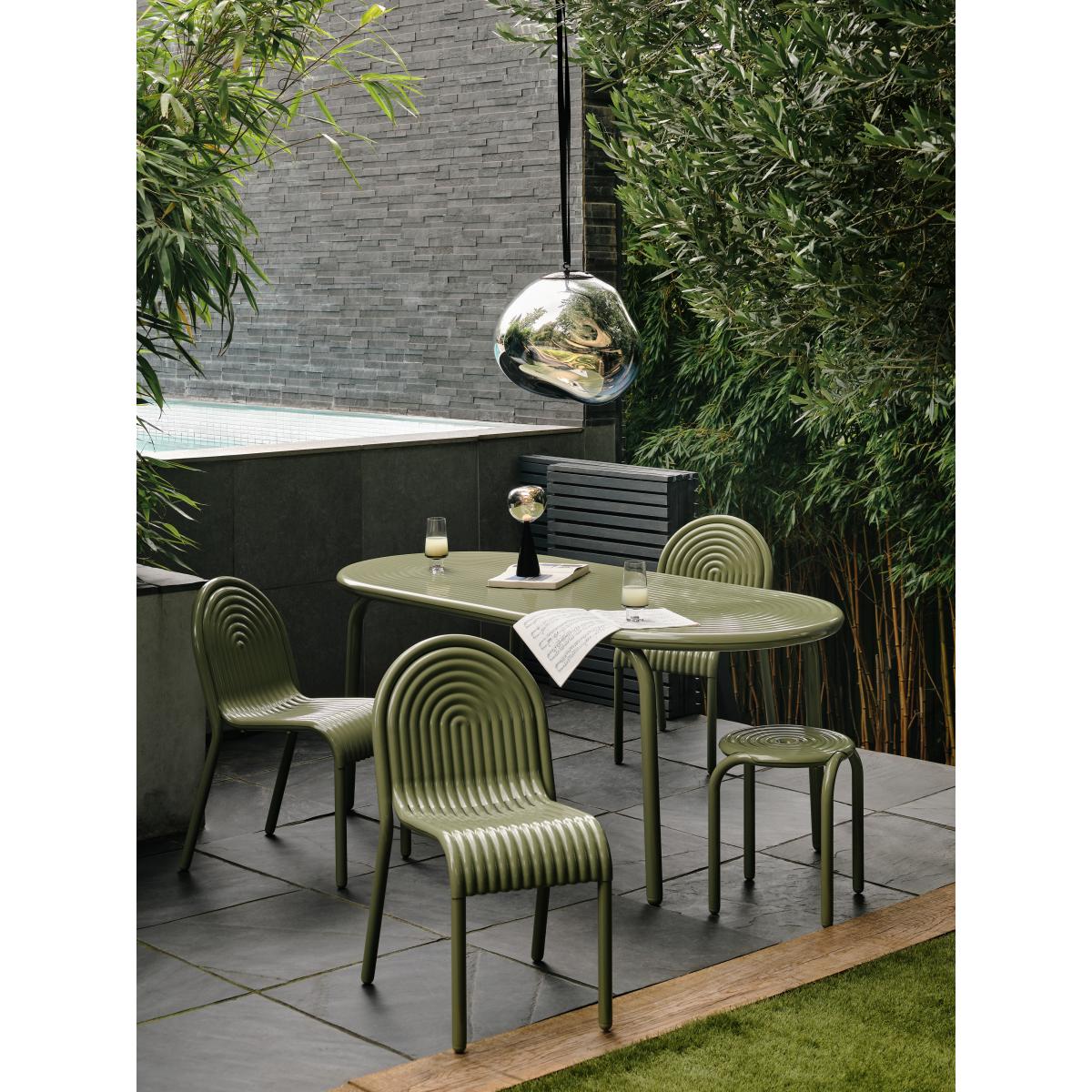 I love this chair for its bold yet versatile design; the ripple effect adds a contemporary edge that can elevate both modern and eclectic outdoor spaces. Its moss green colour makes it a fantastic statement piece that still blends seamlessly with natural surroundings. The grooved plastic construction is practical for outdoor use-easy to wipe clean and durable against the elements. It works well in patios, balconies, or even indoor conservatories where durability is key. To style it effectively, consider pairing it with neutral cushions or a colourful outdoor rug for added comfort and visual interest. Its sturdy design also makes it suitable for frequent use, whether for casual lounging or more formal gatherings.