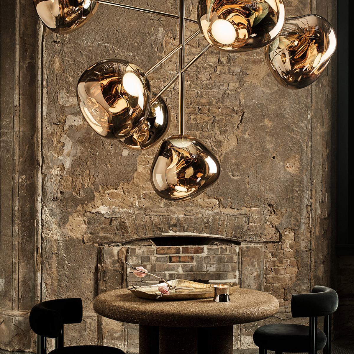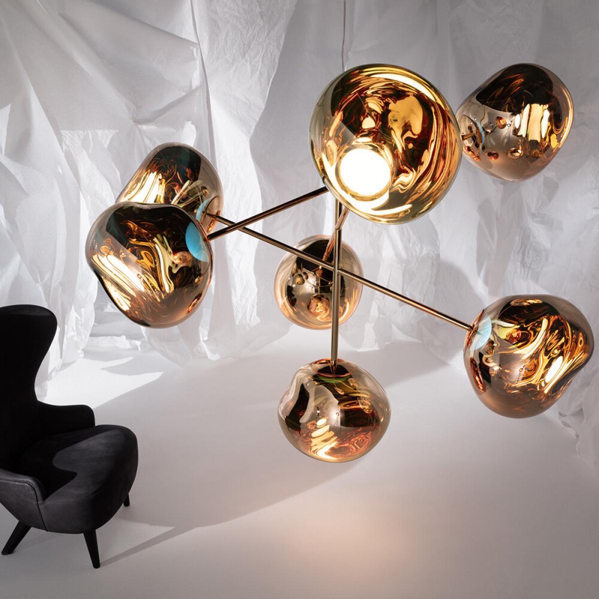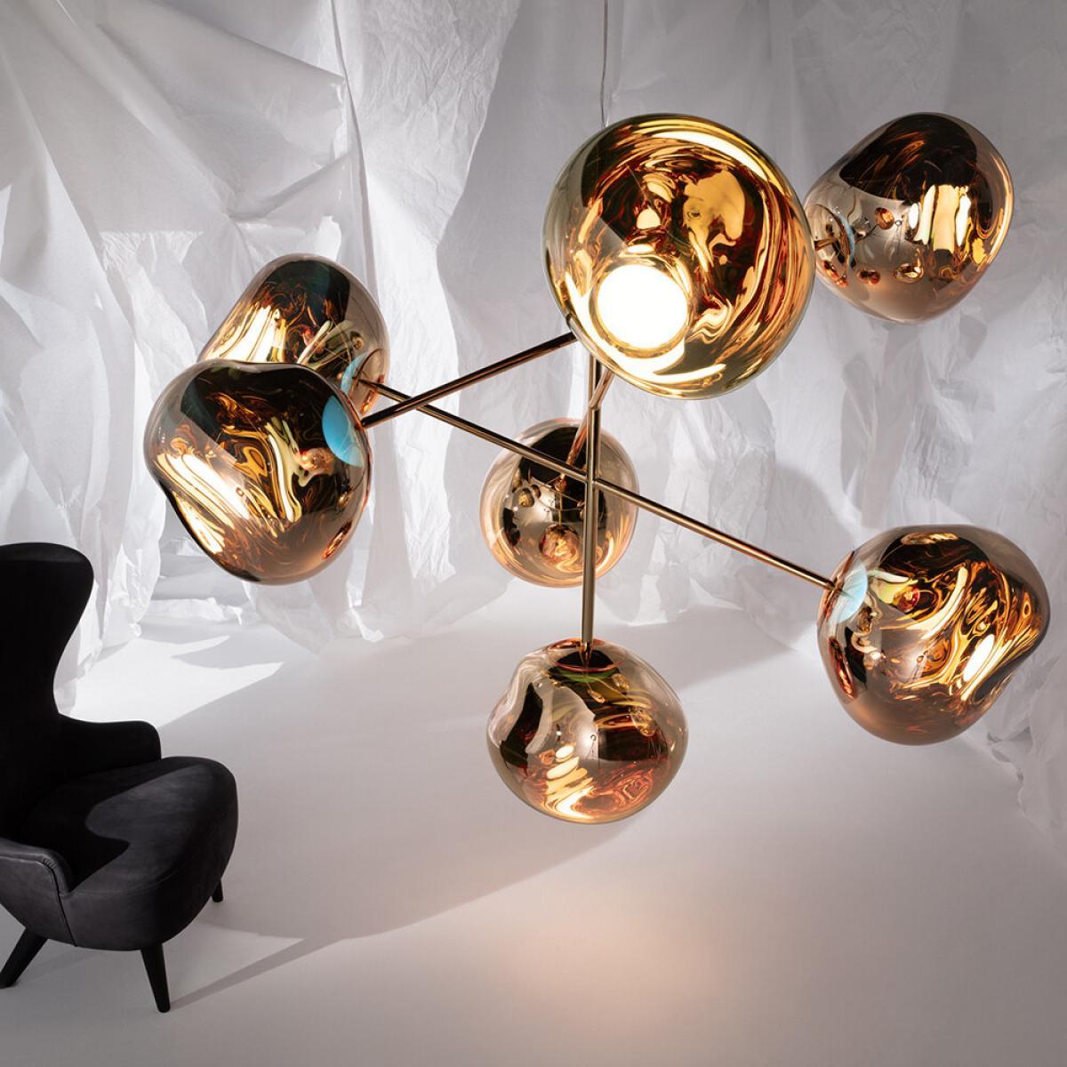 Create a striking display in the home with this Melt chandelier from Tom Dixon. When the light is on, the gold polycarbonate bodies are transformed into a beautiful melted blown-glass effect. With a mirrored finish when it’s not in use, the large size and oversized shape will bring a touch of elegance and intrigue to the space.