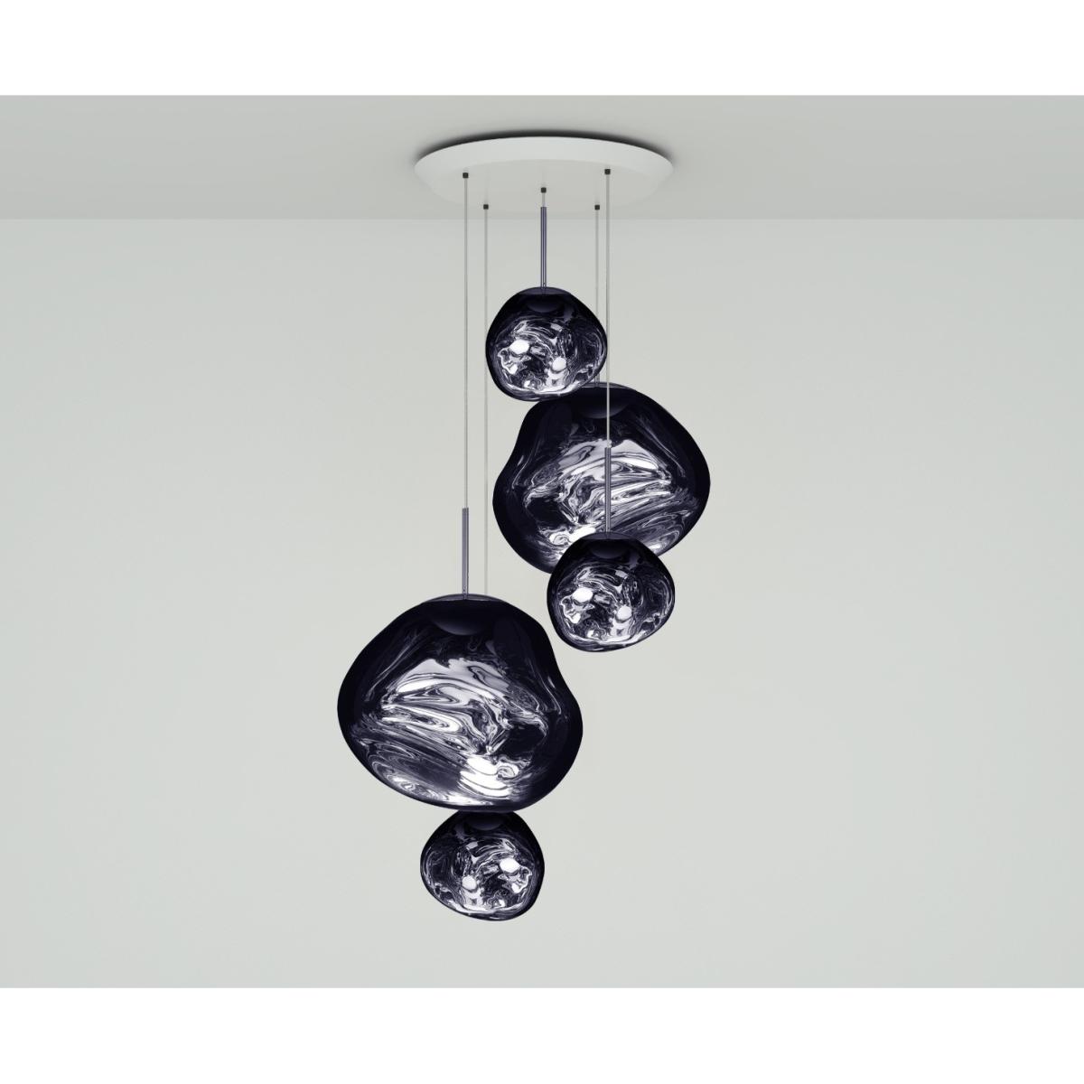 A large round chandelier, featuring two Melt and three Melt Mini pendant lights in a modern Smoke finish. Featuring our intergrated LED module, this ceiling light creates a mesmirizing melting hot-blown glass effect when on and a mirror-finish effect when off. Made in Germany using a high tech manufacturing technique to achieve the perfect melted orb.