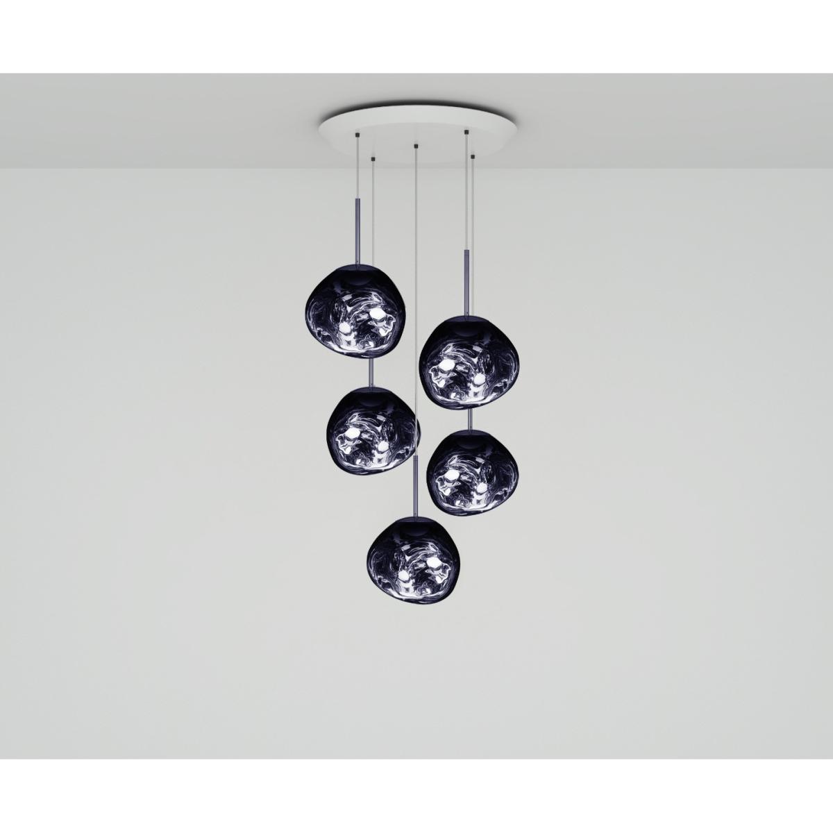An extraordinary chandelier featuring five Melt Mini ceiling lights in a modern Smoke finish. Featuring our intergrated LED module, this ceiling light creates a mesmirizing melting hot-blown glass effect when on and a mirror-finish effect when off. Made in Germany using a high tech manufacturing technique to achieve the perfect melted orb.