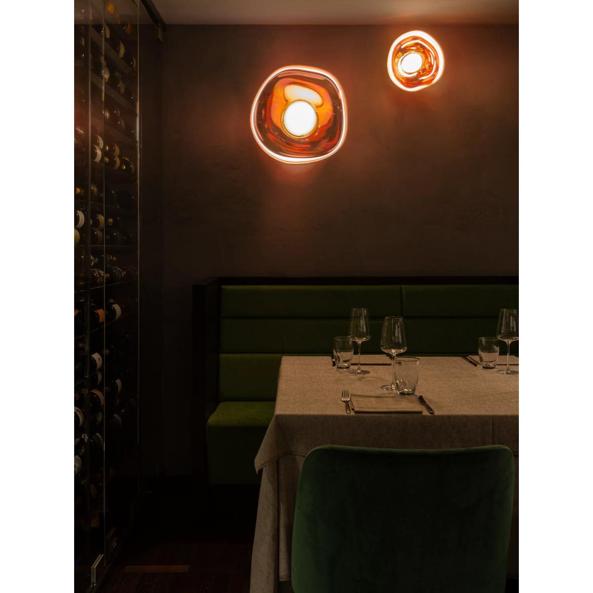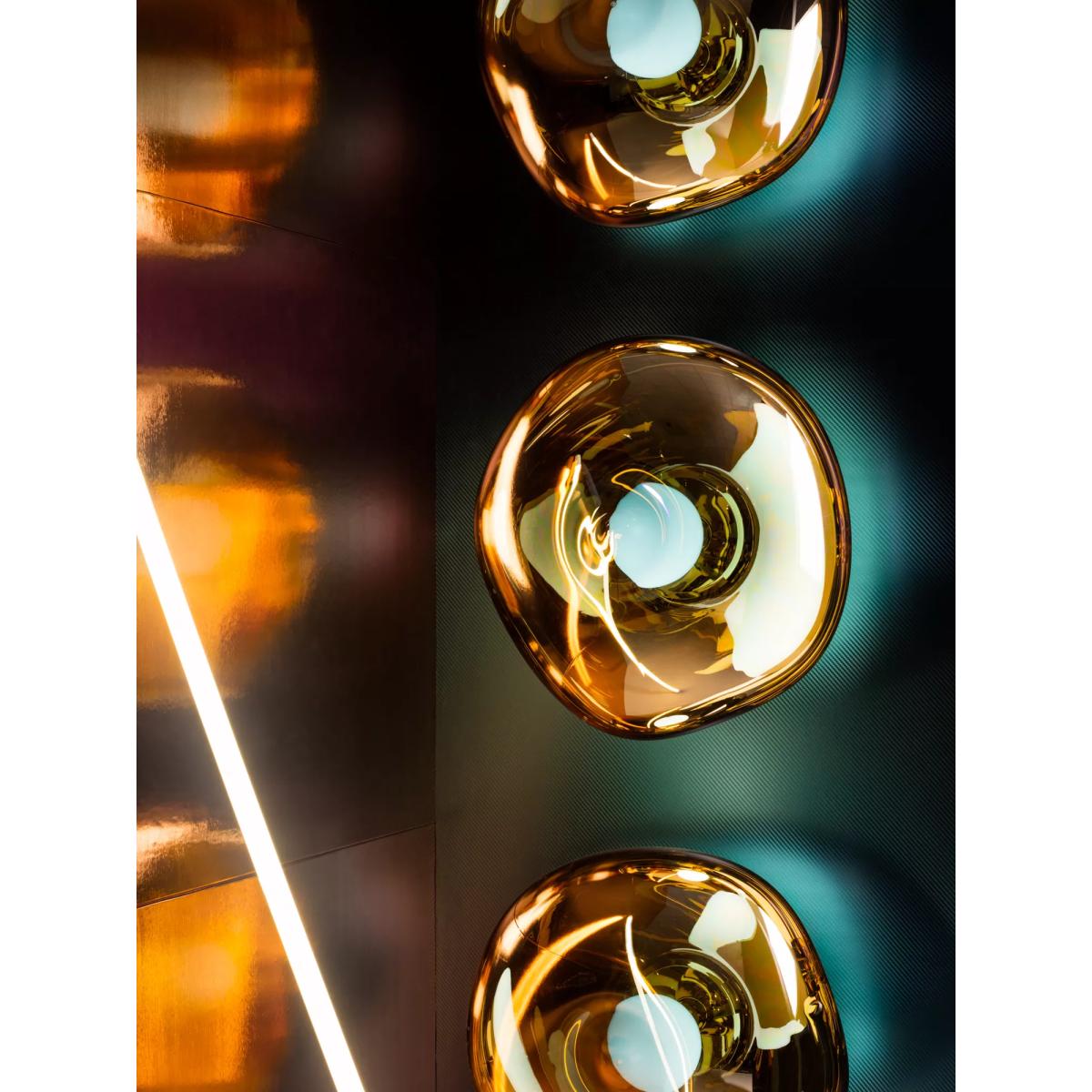 Melt is a beautifully distorted wall light in a modern finish. This integrated LED wall light creates a mesmerising, melting hot blown glass effect when on and a mirror-finish effect when off. Made in Germany using a high tech manufacturing technique to achieve the perfect melted orb.