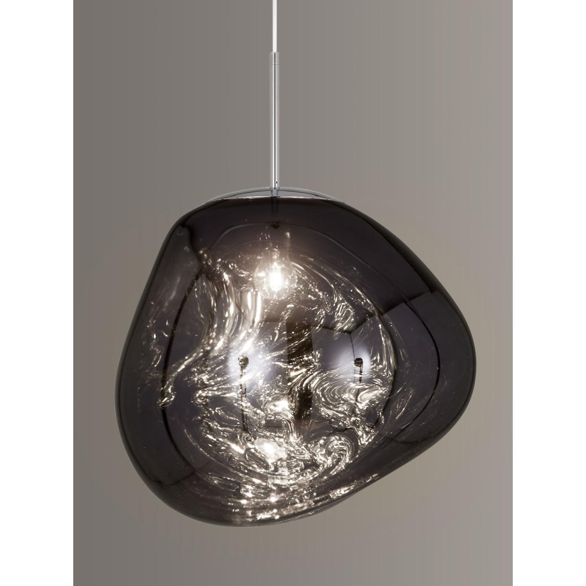 The Melt pendant has been created from Tom Dixon's experiments in the technologically advanced field of vacuum metallisation. The light bounces and reflects around its uneven surfaces to create a unique, melting, hot-blown glass effect. Its eye-catching design was created as a result of a collaboration between Tom Dixon and Swedish radical design collective, FRONT. Please note: This product produces an ambient lighting effect. Its soft light appears translucent when switched on, while the light appears to have a sleek mirror-finish when switched off. Its internal luminosity is visible in full daylight.