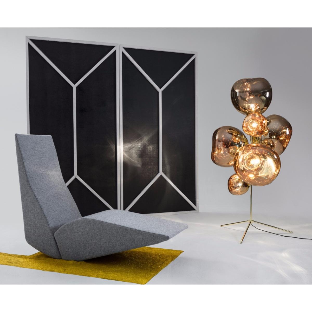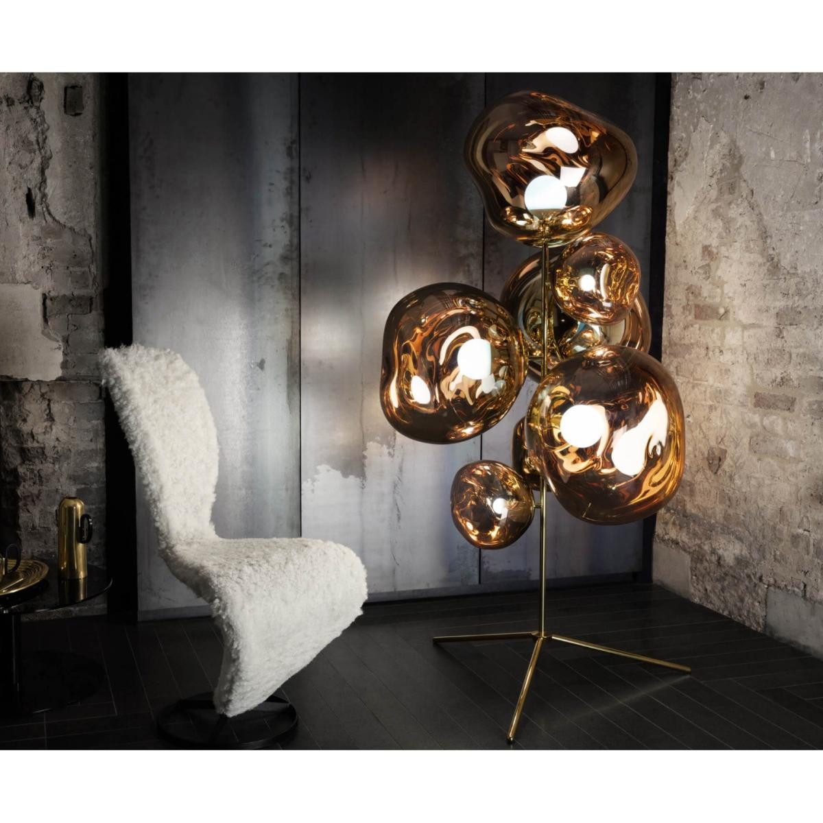 An extraordinary floor chandelier, featuring three Melt Mini shades and four Melt shades in a modern gold finish. Emitting an attractive, mildly hallucinogenic light, this floor light creates a mesmirizing melting hot-blown glass effect when on and a mirror-finish effect when off. Made in Germany using a high tech manufacturing technique to achieve the perfect melted orb.