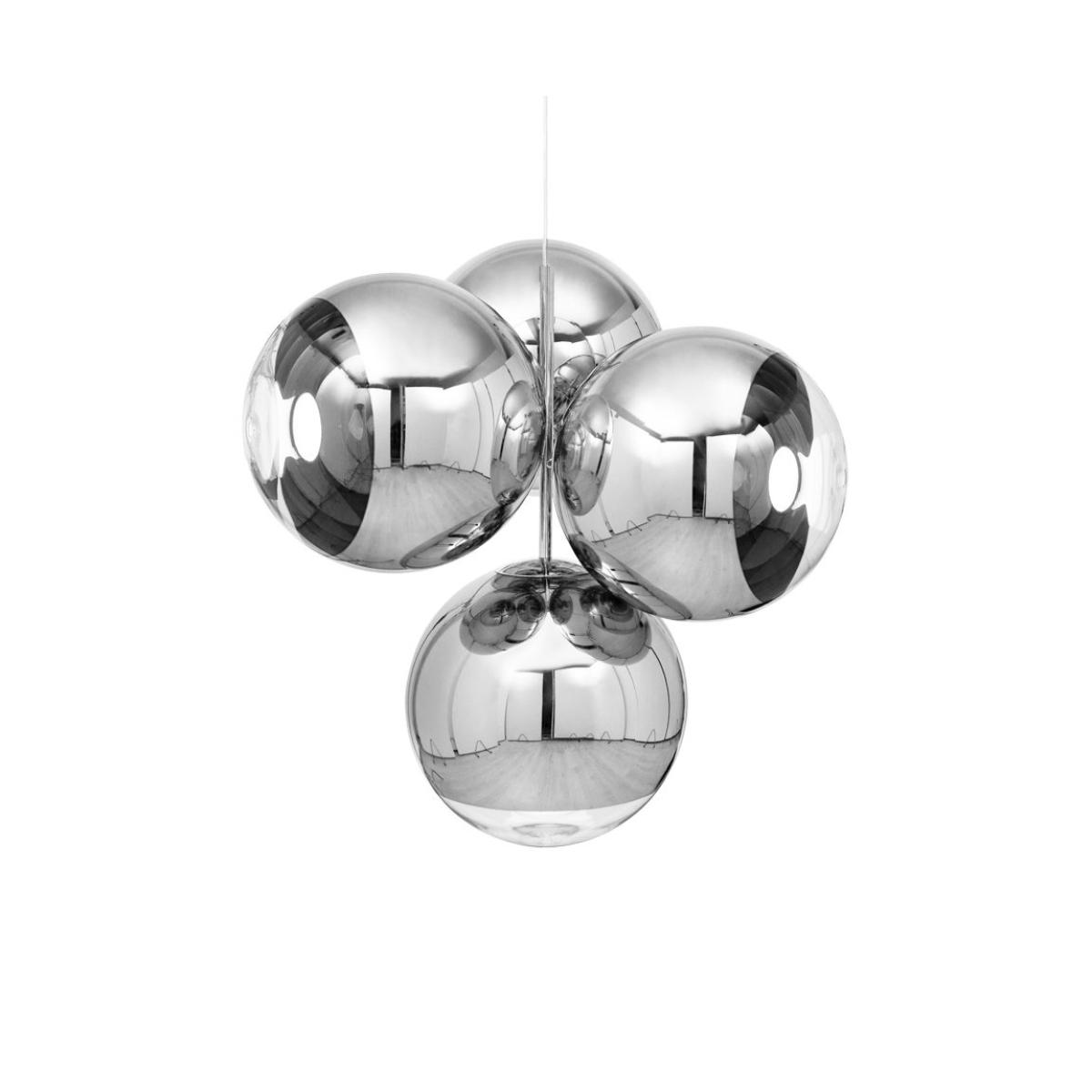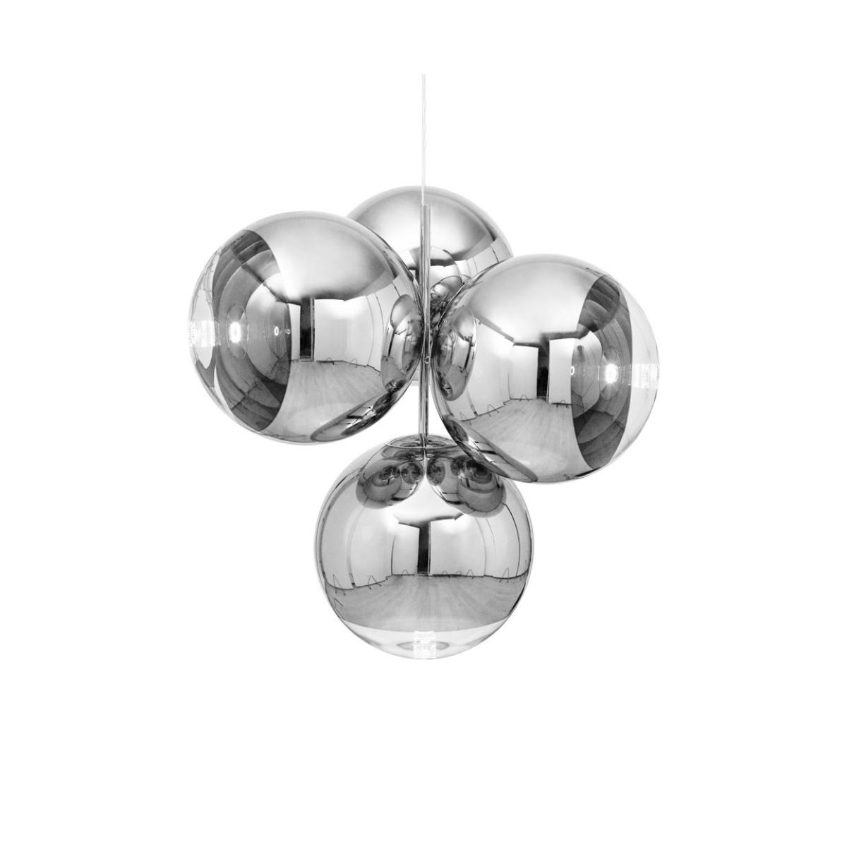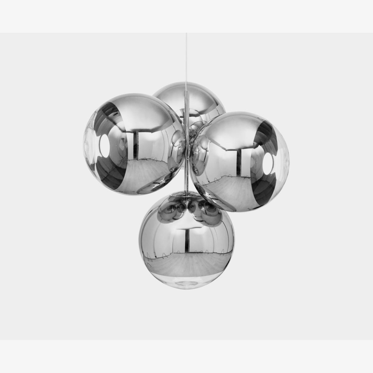 Mirror Ball is created through hi-tech processes of blow moulding and vacuum metallisation to achieve perfect spheres with an unusual luminosity. Mirror Ball Large Chandelier features seven orbs protruding from steel tubes.