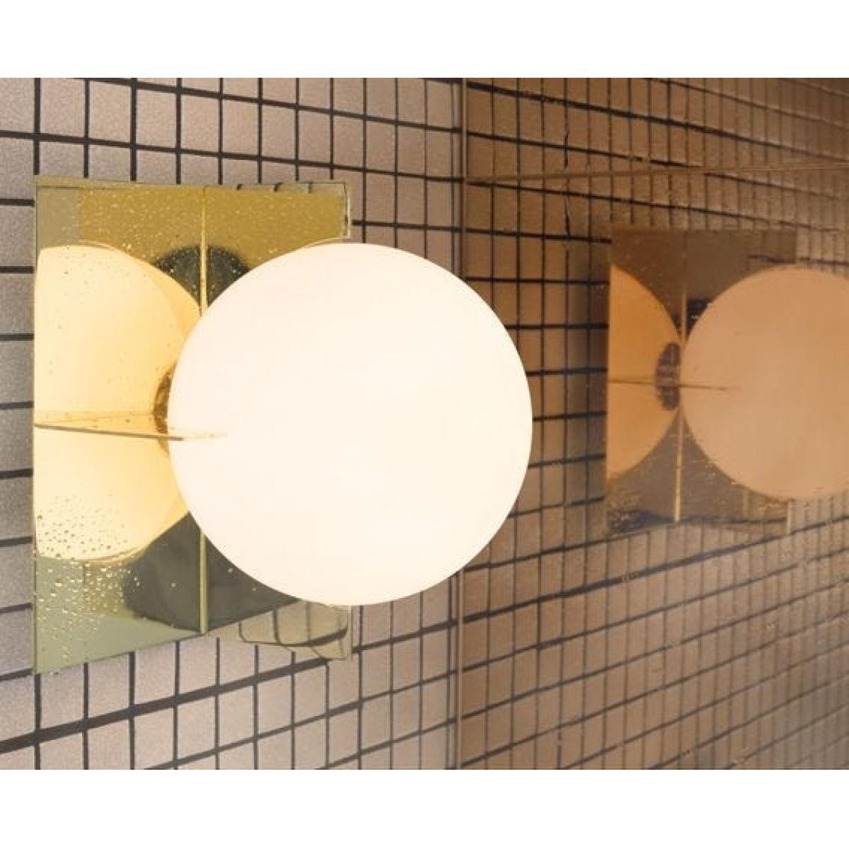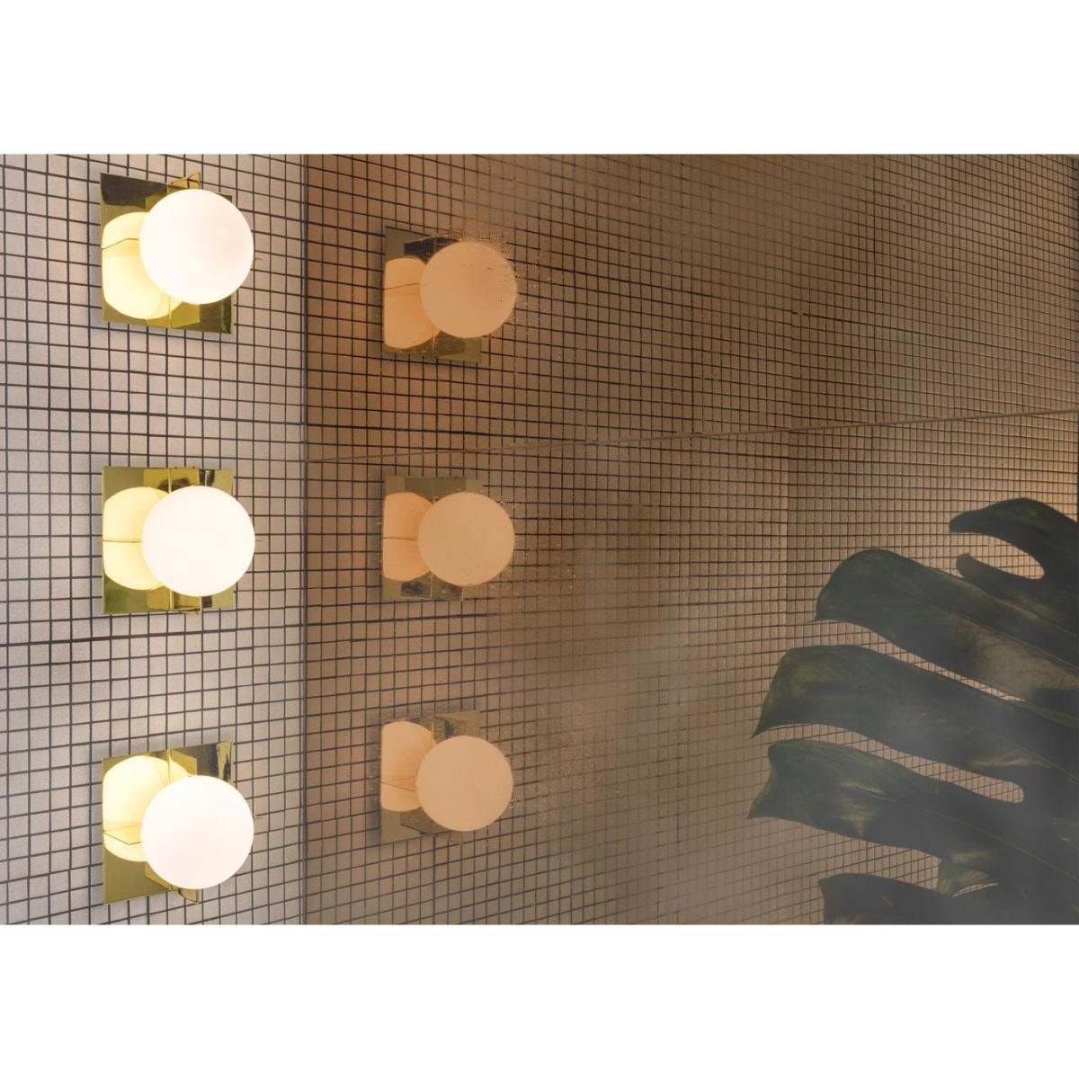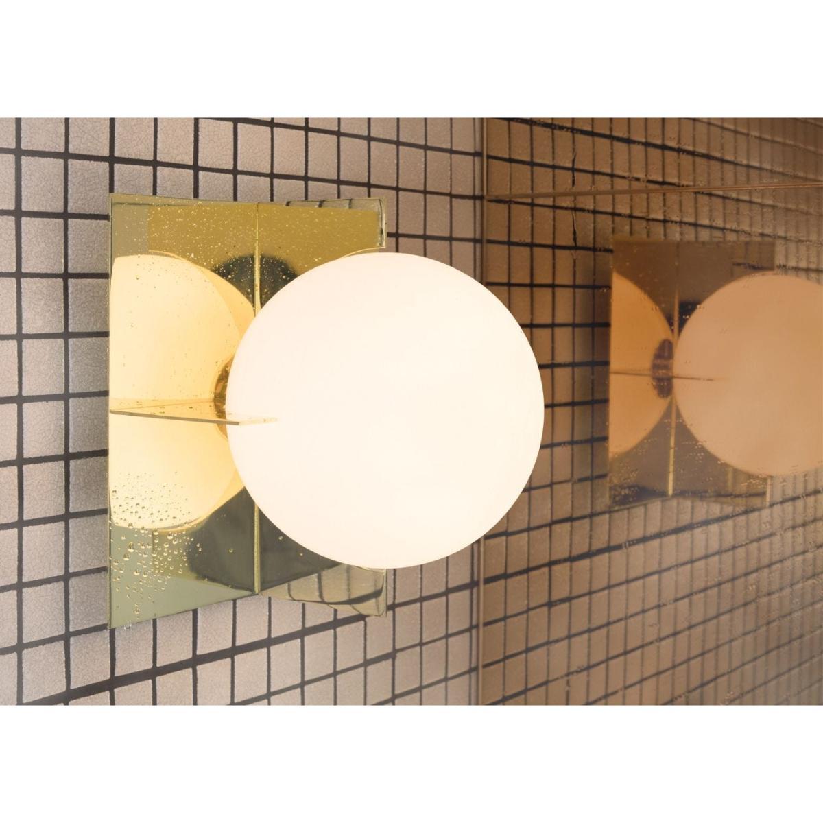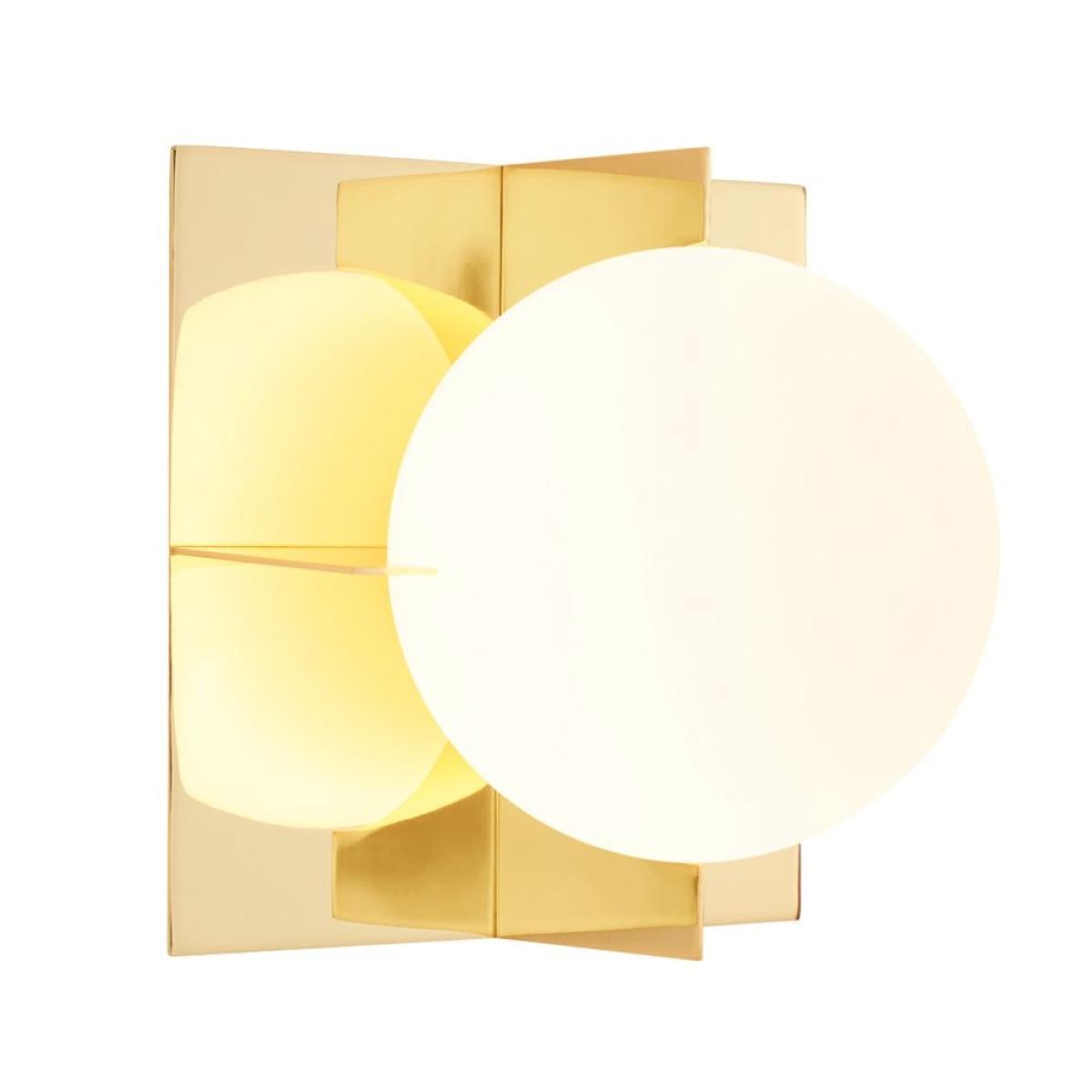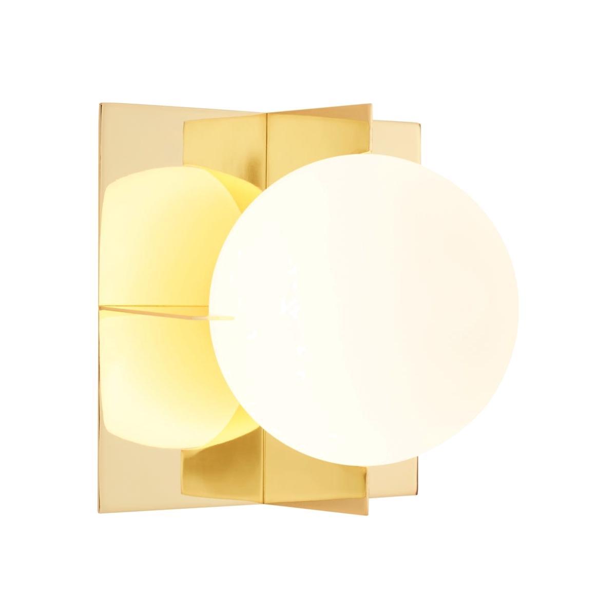 Minimalist yet expressive, the sculptural aesthetic of the Plane Wall Light is built around a confident use of simple geometric shapes. This original Tom Dixon design is constructed from two interlocked square brass-plated steel frames that enclose a double-layered white glass sphere.