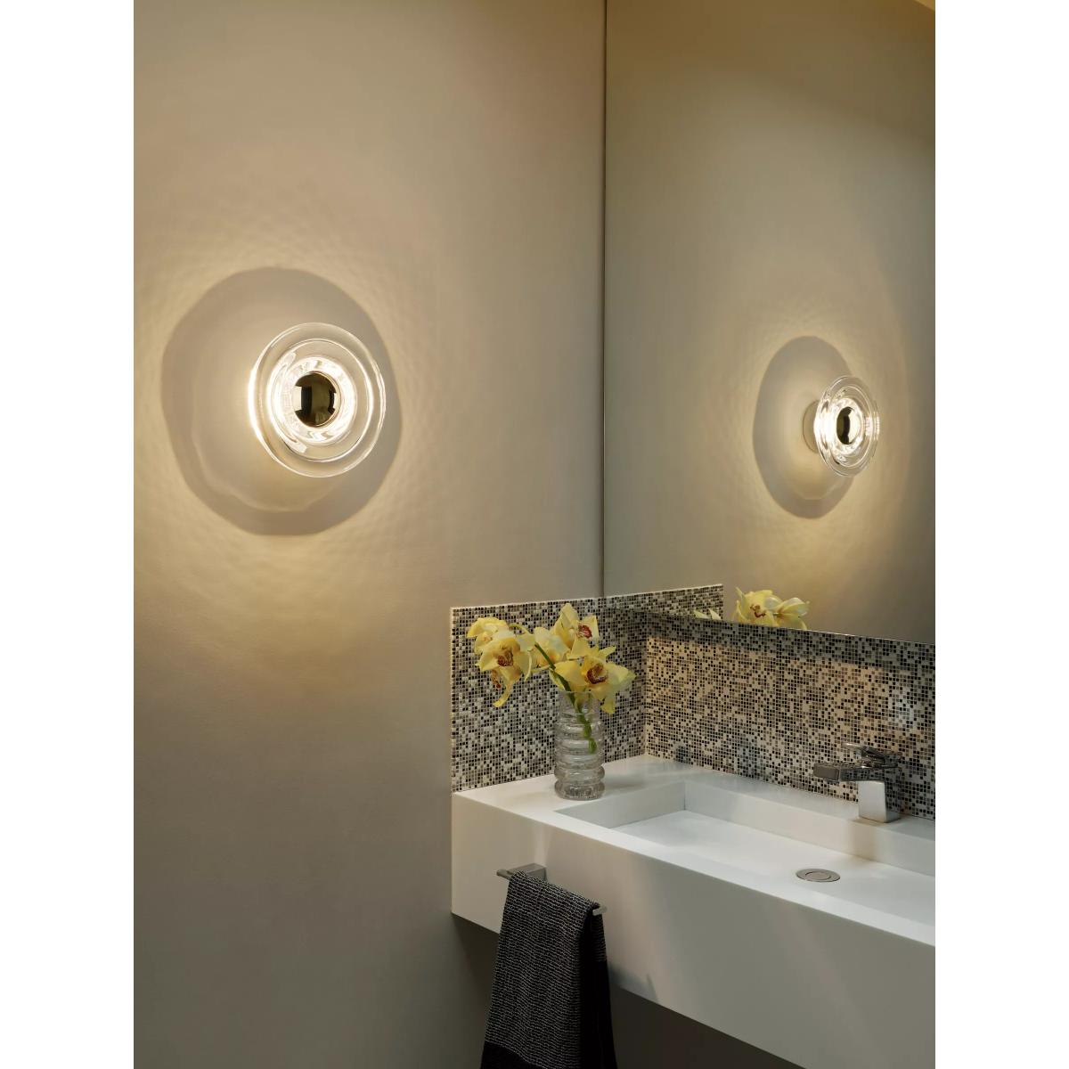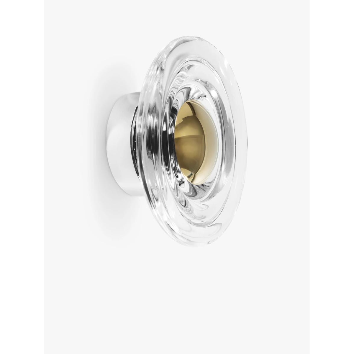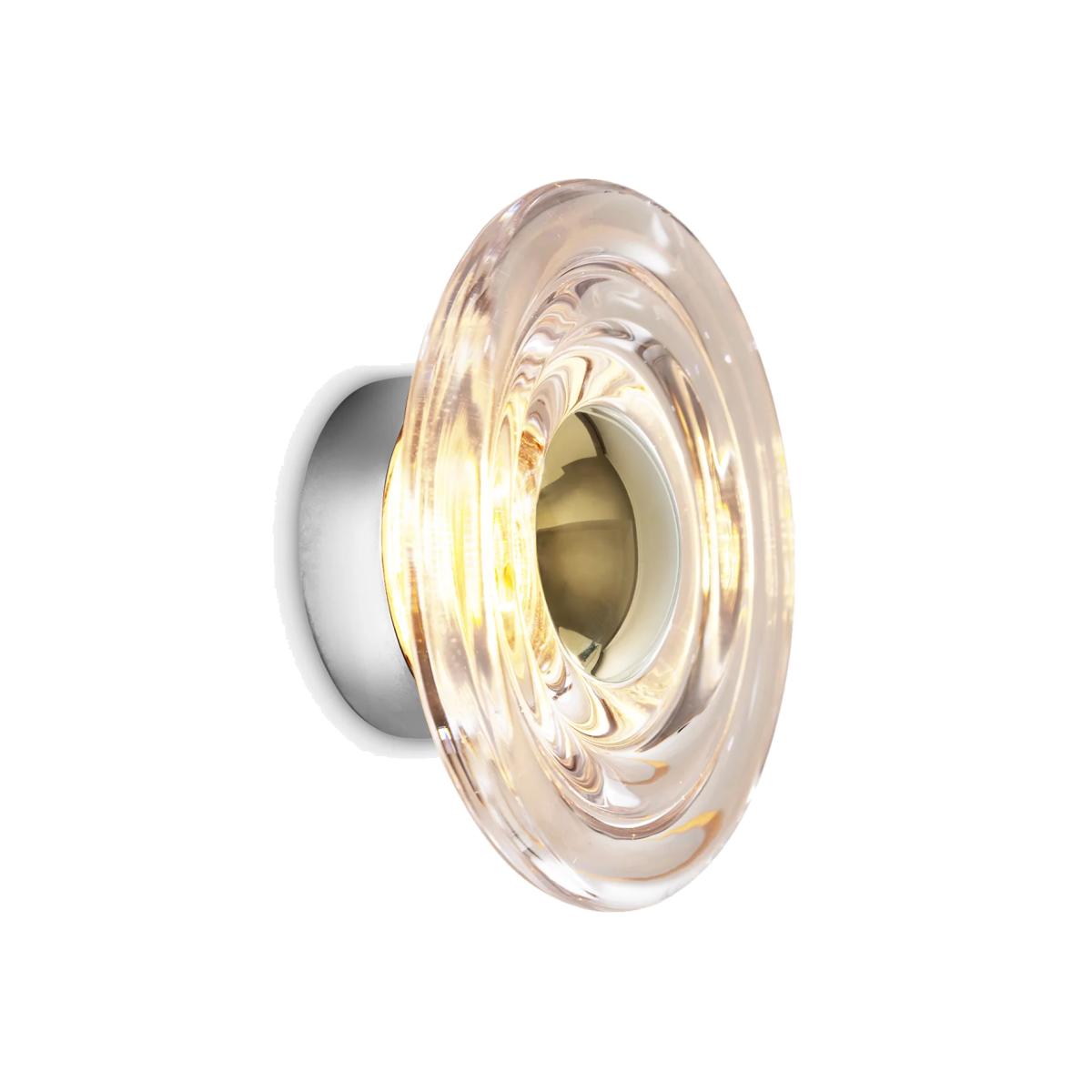 Stunning contemporary mini wall light made of the thickest industrially pressed glass. Designed and engineered to catch and refract light and to last forever. The ribbed glass creates a diffusion of the light source and projects linear and stripy patterns. The metal dome on the surface light has been upgraded from a flat cap to a curved dome, for a cleaner aesthetic. The tiny bubbles in the glass are a celebration of how the products are made and naturally appear when the glass is hand-pressed. IP45 rated and can be used indoors and outdoors.